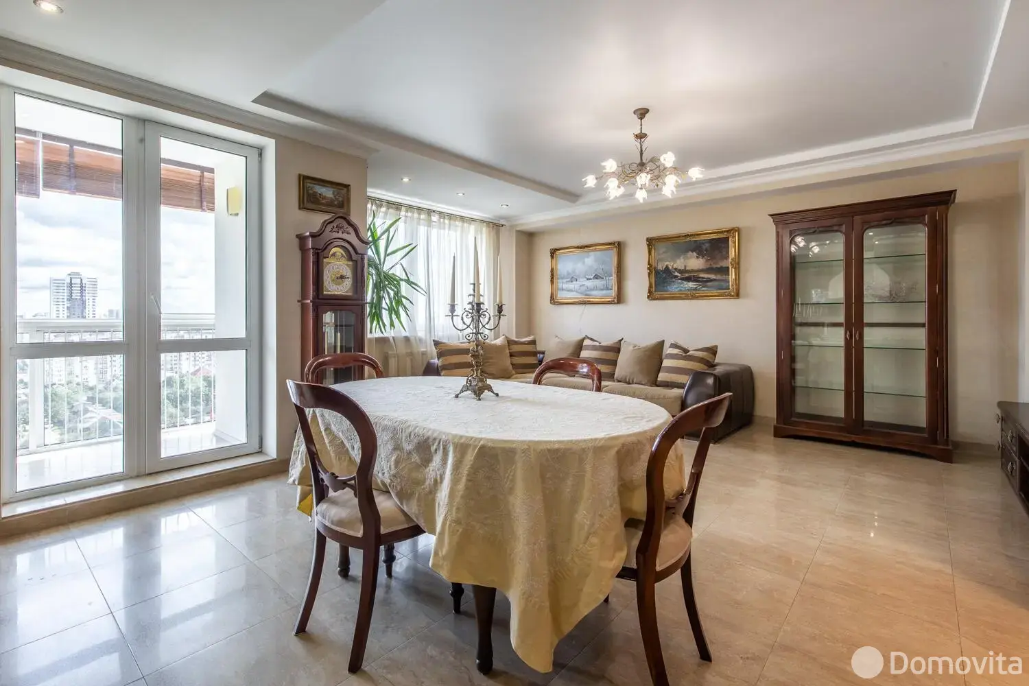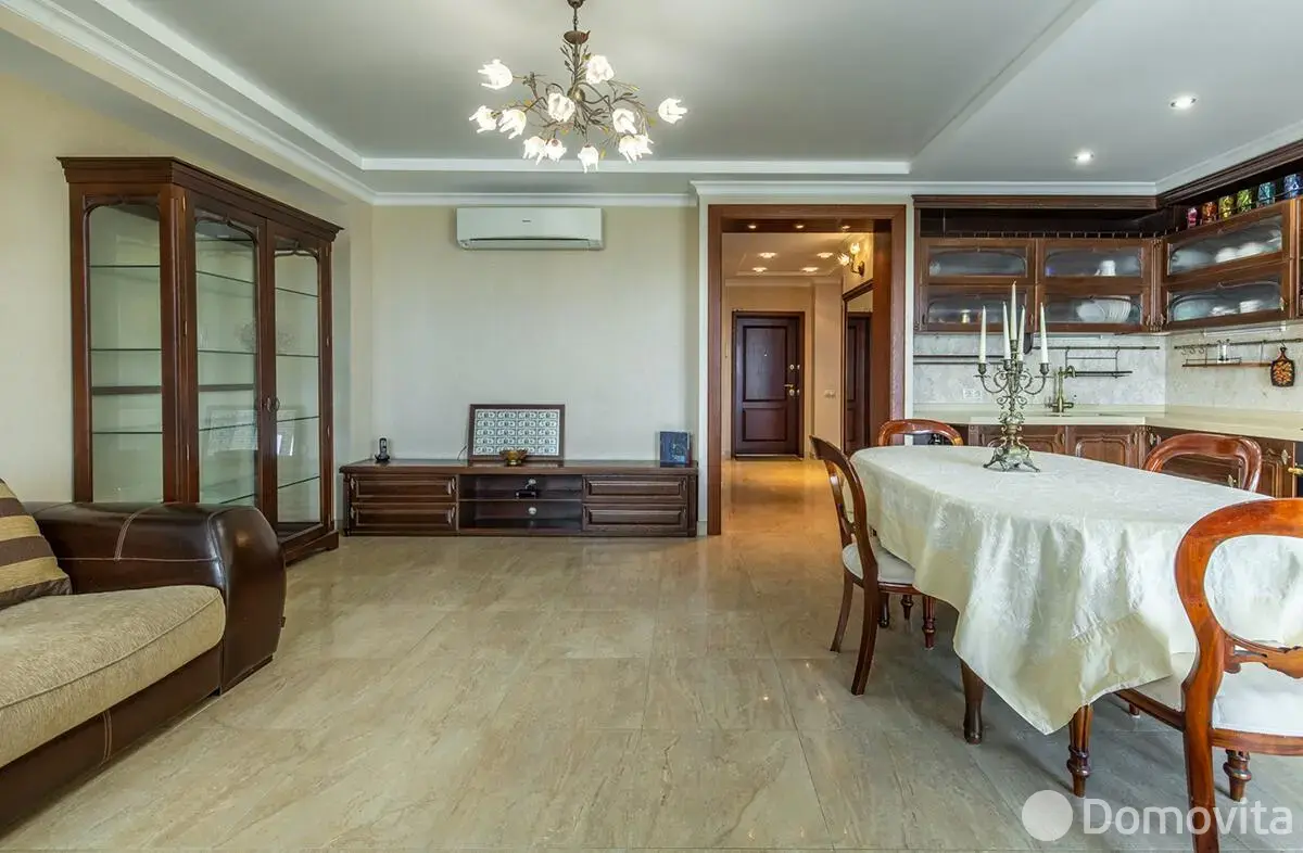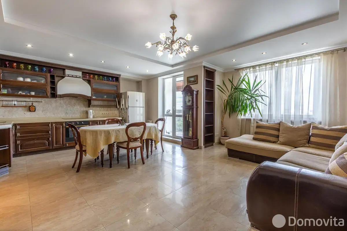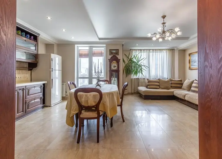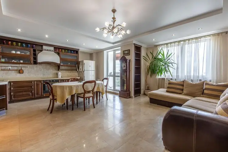 В гостиной кухня итальянского производства, в классическом стиле из массива ценных пород дерева, с каменной столешницей, шкафчики с кованой фурнитурой. Встроенная бытовая техника: электрическая варочная панель, посудомоечная машина, холодильник увеличенной ширины, духовка, вытяжка.