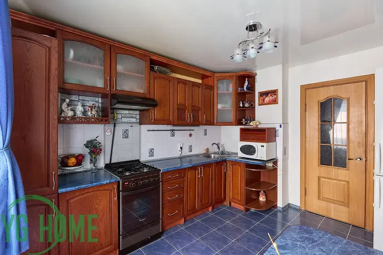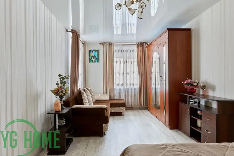 Состояние квартиры отличное, выполнен хороший ремонт. Полы – ламинат/линолеум/плитка; на стенах - обои; все окна - деревянные; в ванной полы/стены облицованы плиткой, потолки – натяжные.