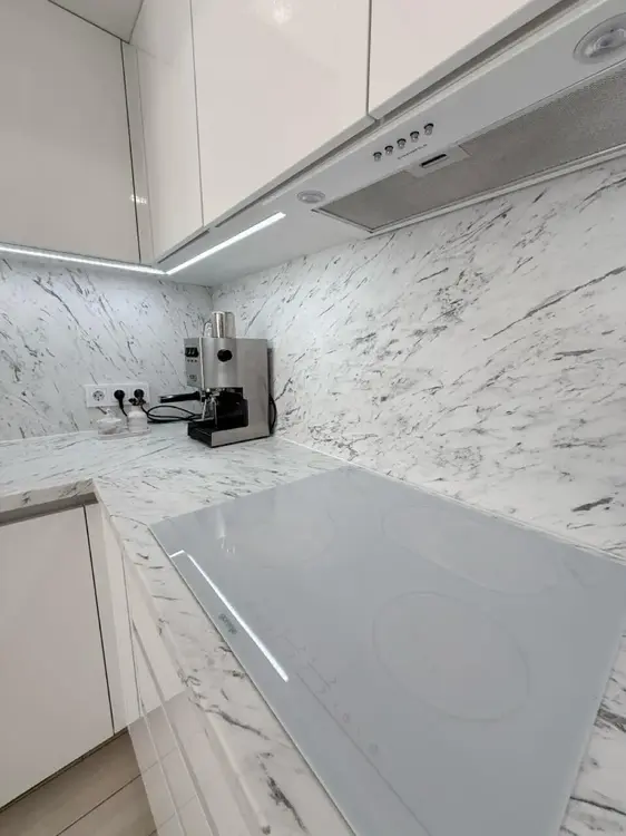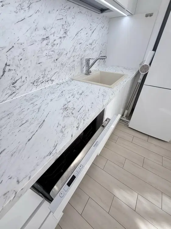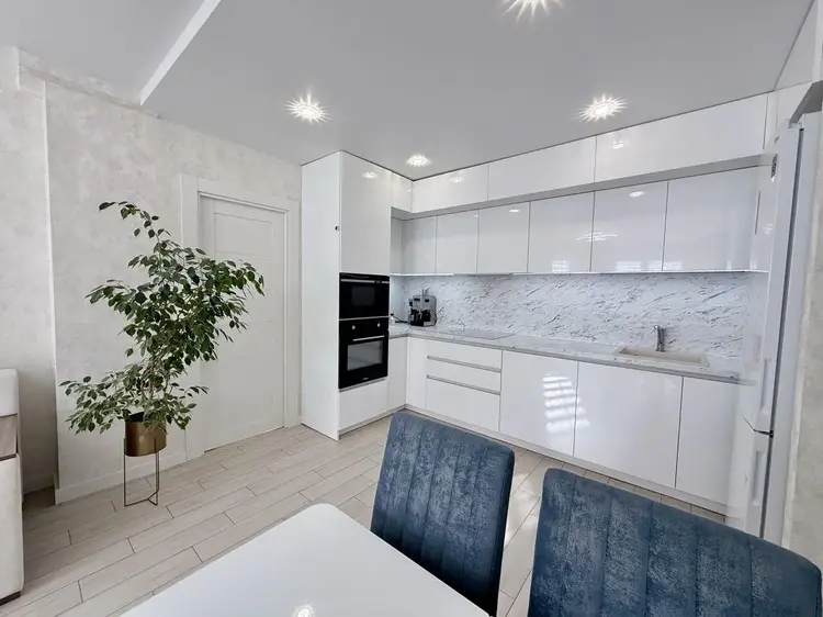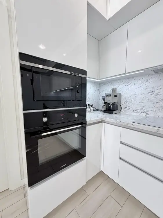 Встроенная кухня до потолка-мест хранения хватит для всего. Шкафчики на качественных доводчиках. Техника вся встроенная и именитых производителей.