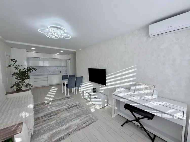 На стенах моющиеся обои. Потолки во всей квартире натяжные матовые, с различными зонами освещения.