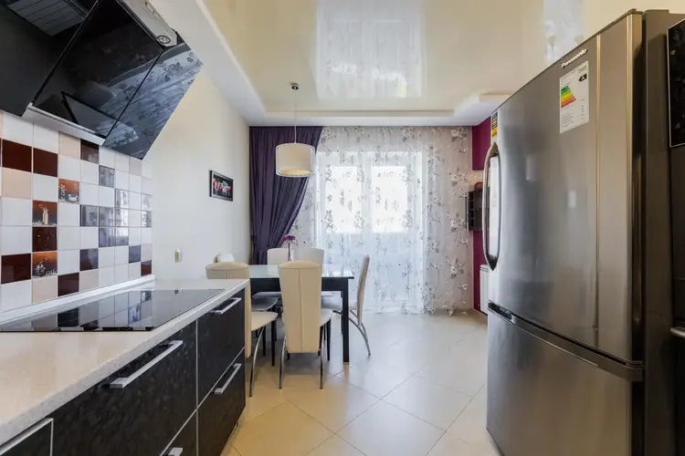 • Стильная, удобная корпусная и мягкая мебель, продумана система хранения; кухонная мебель со встроенной бытовой техникой: духовой шкаф c функцией СВЧ, варочная панель, вытяжка, посудомоечная машина, а также холодильник -немецкого производителя Siemens; мойка из искусственного камня с дозатором и смесителем Blanco; в санузлах дорогая импортная сантехника производства Германии и Франции, столешница- натуральный камень, стиральная машина