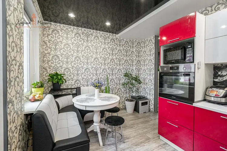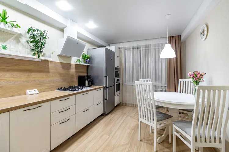 Встроенная кухня с духовым шкафом, варочной панелью, холодильником и стиральная машина входят в стоимость. Из мебели в квартире остаются: стол с кухне в диваном, детская корпусная мебель (без кроватей), вся прихожая, секция в гостиной и шкаф в спальне.