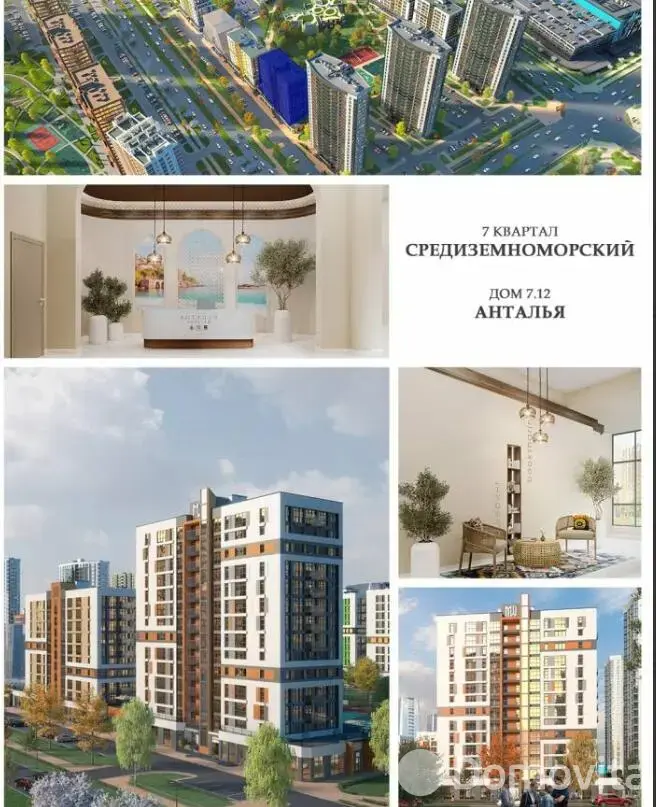 Дом «Анталья» в квартале «Средиземноморский». Одна секция в 14 этажей по 10 квартир на этаже, начиная со 2-ого. Из лестнично-лифтового холла запроектированы выходы в 2 межквартирных коридора, в каждый из коридоров выходит по 5 квартир. Фишки: на 2 этаже 6 квартир – с собственными огражденными террасами, со всех террас есть выход на эксплуатируемую кровлю стилобата. Квартиры 3-14 этаж типовые, балконы - с ограждением экранного типа из безопасного стекла. На первом этаже размещены коммерческие помещения.