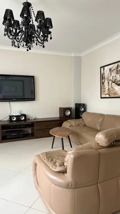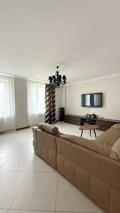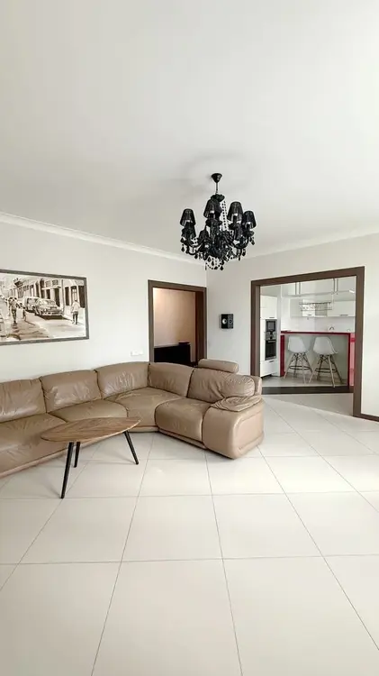 Гостиная — территория уюта и больших компаний. Просторная, светлая, с удобнейшим кожаным диваном, который так и шепчет: «Бросай всё, у нас марафон «Властелина колец». Эффектная черная люстра добавит драматизма вашим вечерам.