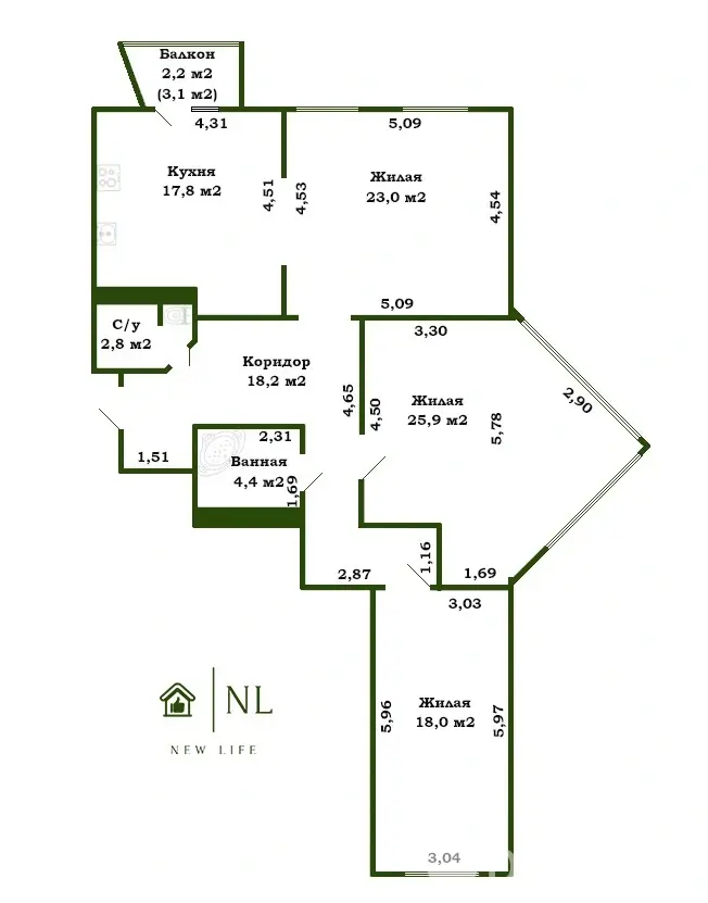 Площадь, которой можно гордиться: Общая – 108.5 м2 по СНБ, жилая – 58.3 м2, кухня – 17.7 м2. Места хватит всем: и вам, и коту, и вашей коллекции виниловых пластинок.