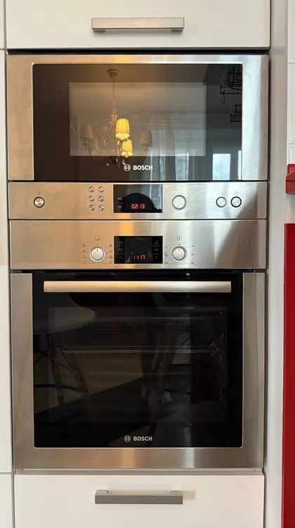 Кухня, достойная шеф-повара (и ваших утренних сырников). Это не просто место для готовки, это командный центр вашего хорошего настроения. Ярко-красная столешница будит лучше любого эспрессо, а полный комплект техники Bosch (включая холодильник side-by-side, который сам делает лед для ваших коктейлей) превращает рутину в удовольствие. Футуристичная вытяжка Elica позаботится, чтобы аромат вашего стейка не смешивался с вашими планами на вечер.