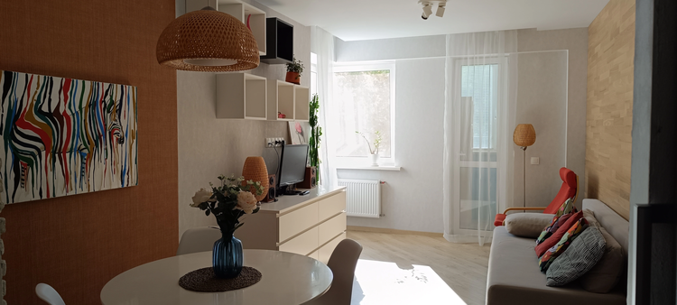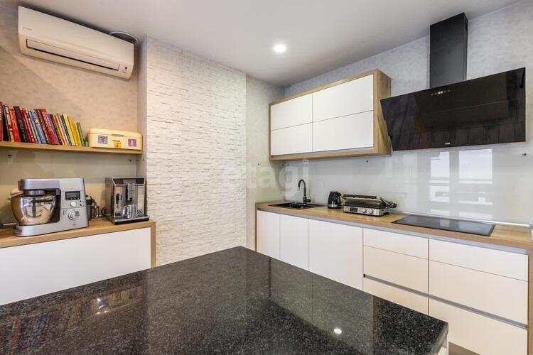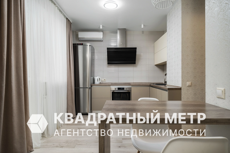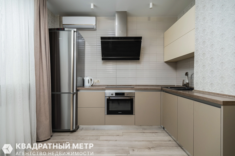 Квартира расположена на 19-м этаже, что открывает прекрасный вид на город, окна выходят на обе стороны дома. В квартире выполнен стильный современный ремонт. Окна ПВХ, лоджия с панорамным остеклением, на полу ламинат и плитка, грамотно и практично разведена электрика, натяжные потолки, 2 санузла облицованных плиткой, встроенные места для хранения, современные двери и фурнитура, кондиционер. Квартира оборудована современным кухонным гарнитуром со встроенной бытовой техникой LIEBHERR и BOSCH. Ремонт выполнен в светлых тонах с использованием только качественных материалов.