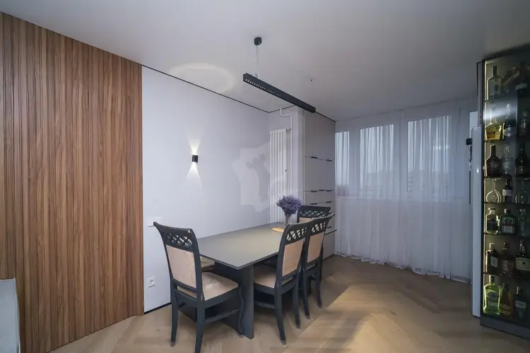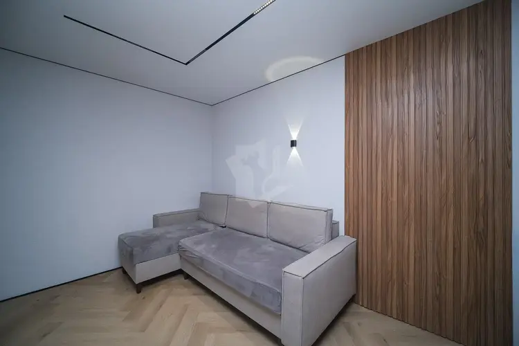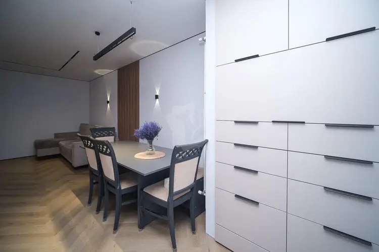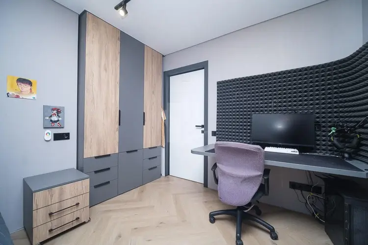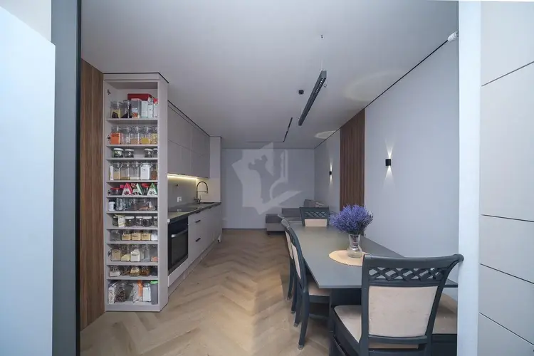 В квартире выполнен свежий дизайнерский ремонт. Сразу обращает на себя внимание многоуровневое фантазийное освещение. Не останется незамеченным современное покрытие пола замковым кварцвинилом: уложенный елочкой по всей квартире, без порогов, он создает единство стиля. Эстетика сочетается с практичностью и экологичностью