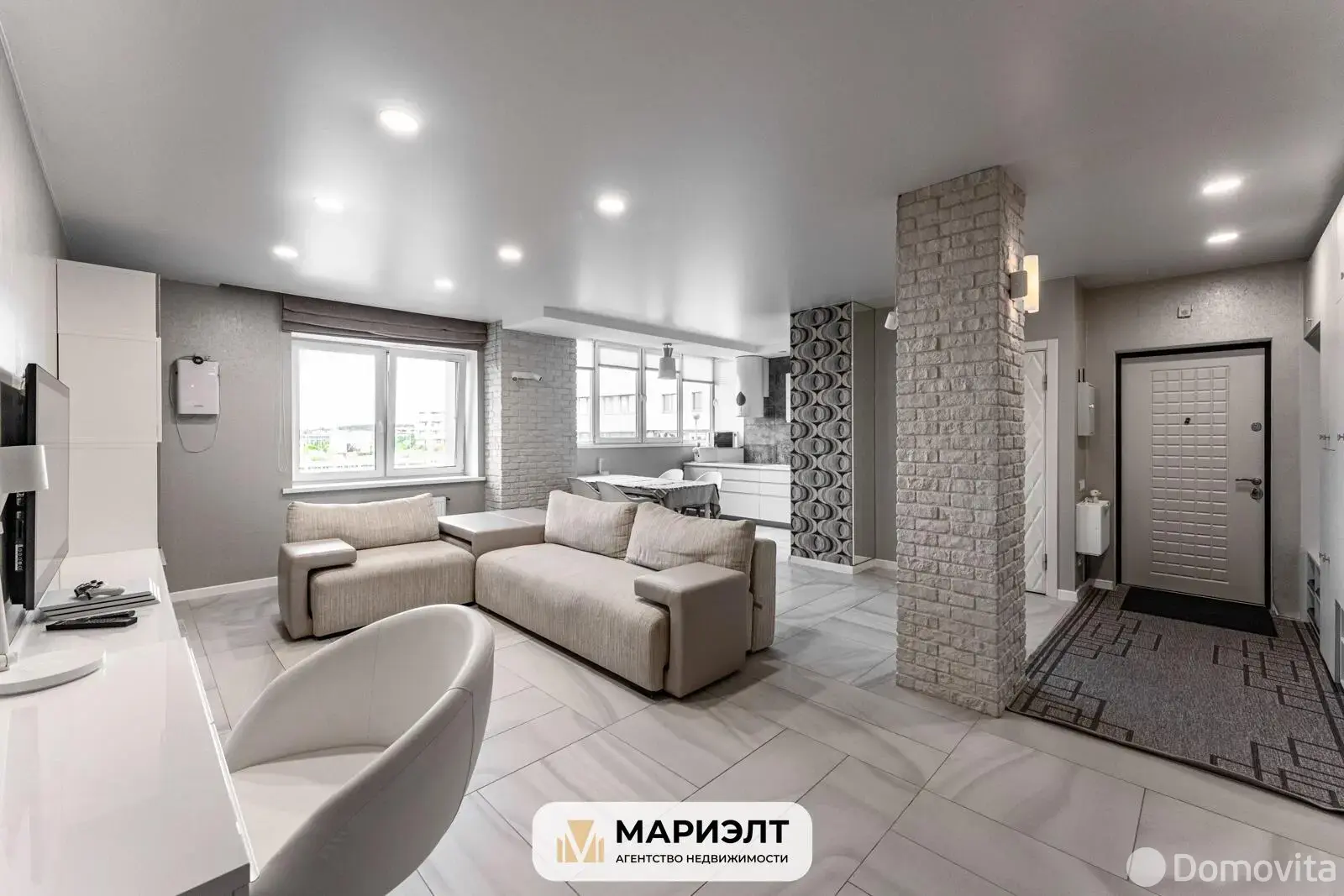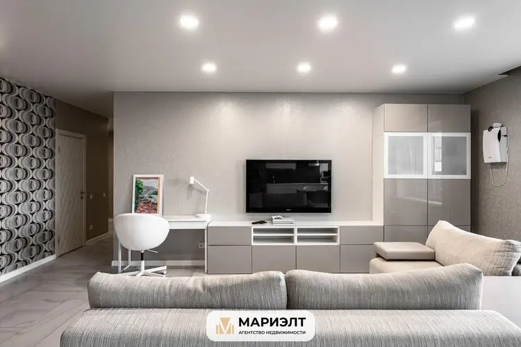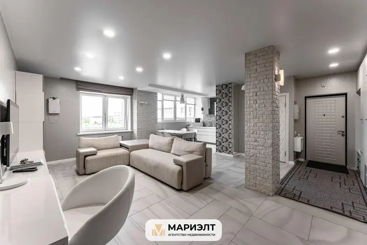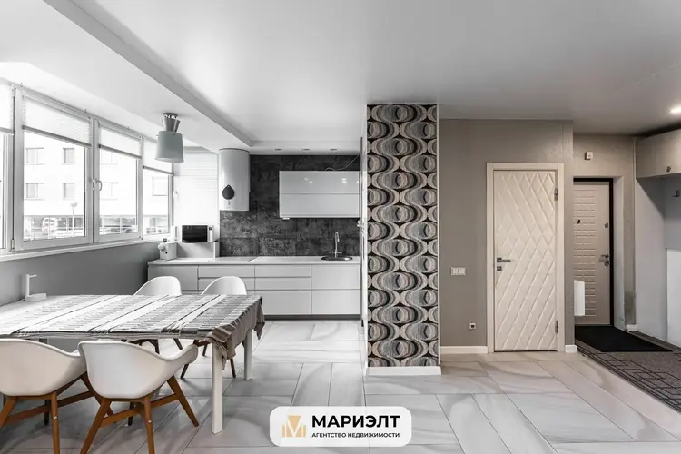 В комнатах на полу ламинат, потолки натяжные, изысканные обои. В прихожей, в жилой совмещенной с кухней на полу плитка. Санузлы отделаны светлой плиткой с дизайнерской раскладкой. Межкомнатные двери комбинированные, массив с эко-шпоном.