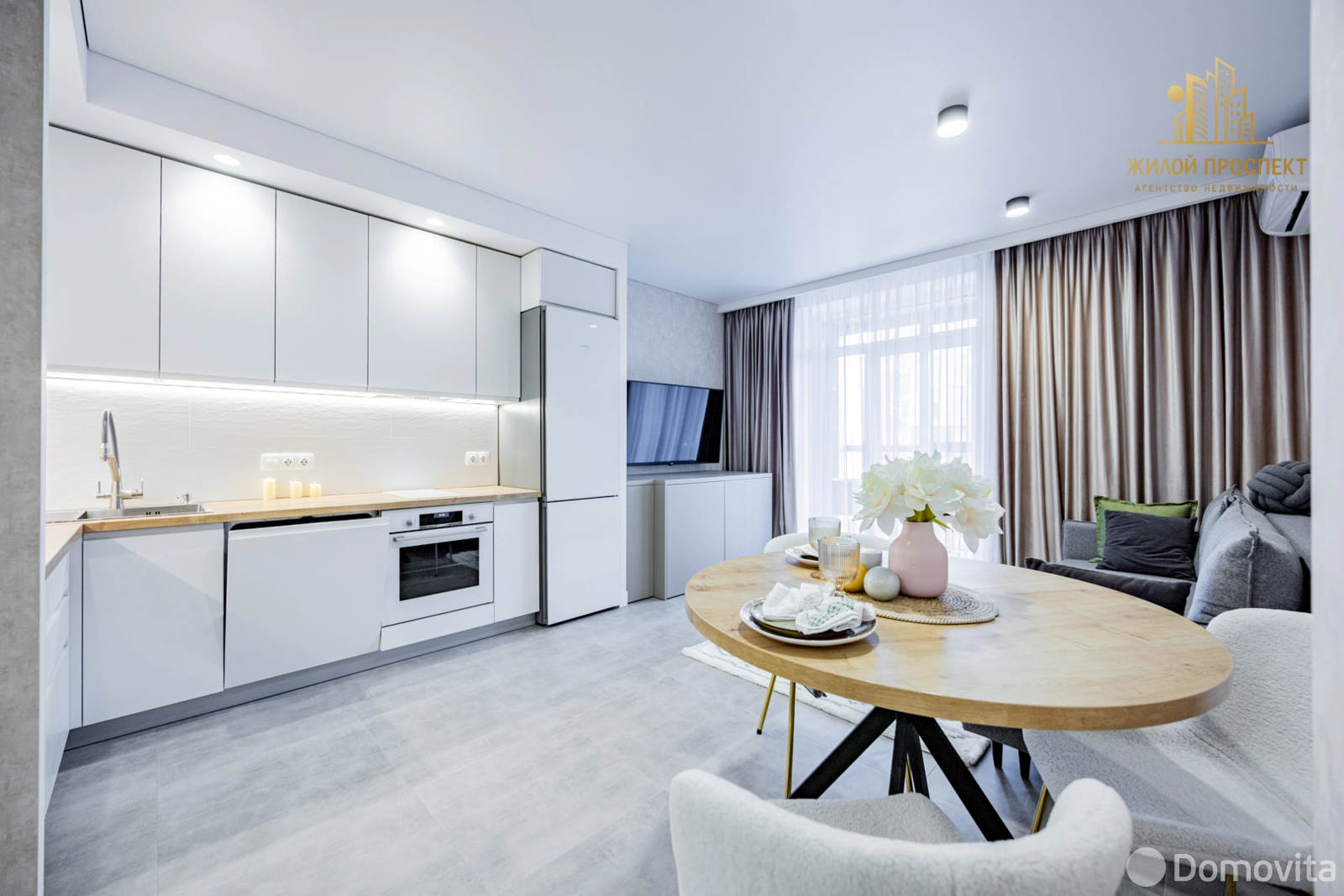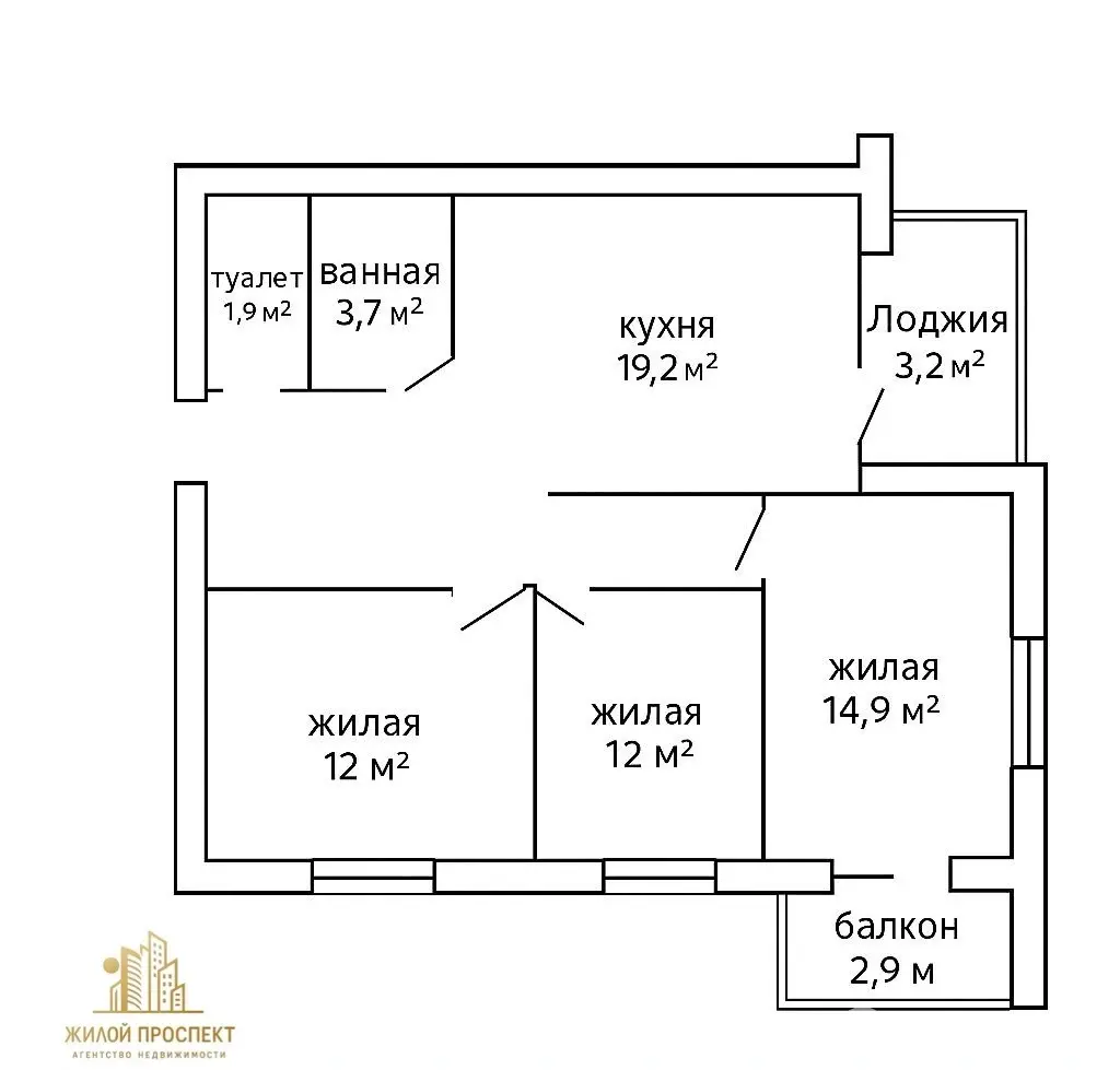 Квартира имеет просторную планировку, которая включает в себя кухню-гостиную, 3 спальни, 2 санузла и 2 лоджии.