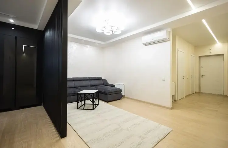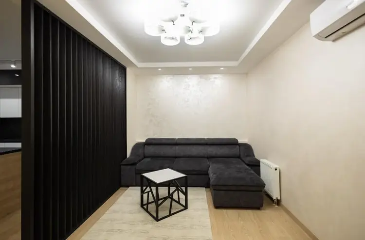 штукатурка и жидкие обои, на полу – ламинат и плитка, бойлер, кондиционер