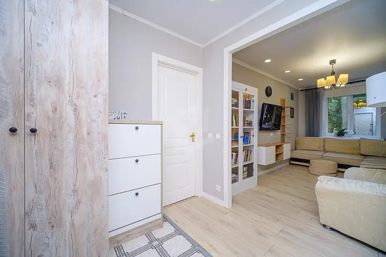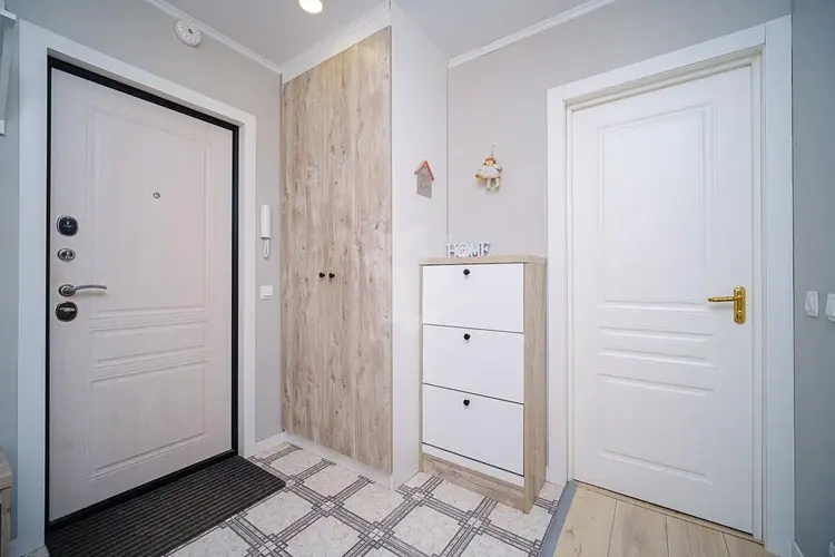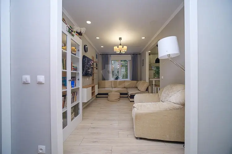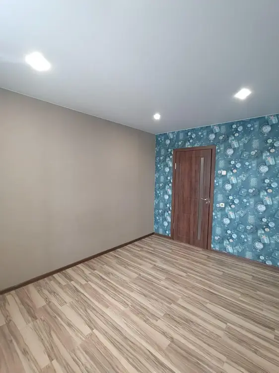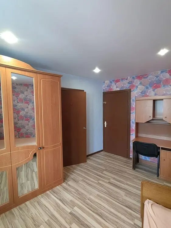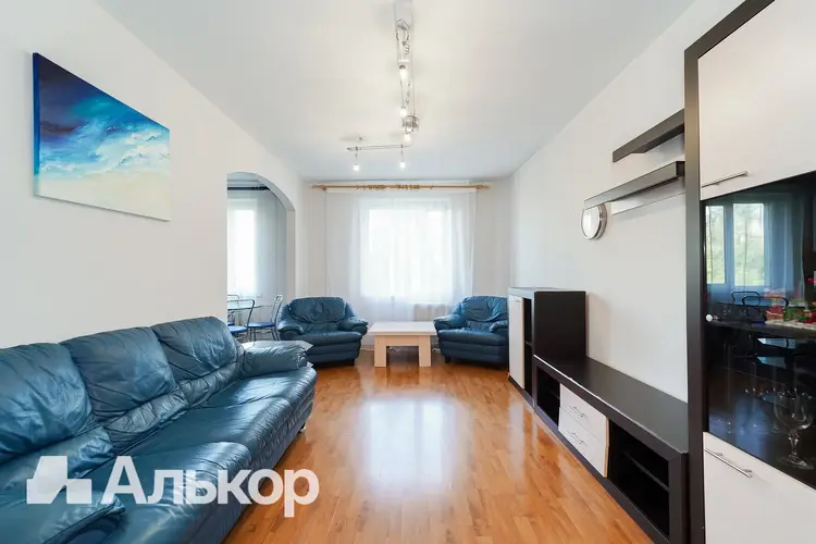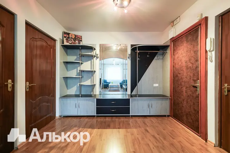 Межкомнатные двери. Напольное покрытие ламинат (жилые комнаты, кухня, частично коридор), плитка (санузлы и частично коридор). Есть вместительные шкафы.