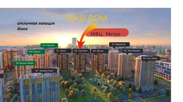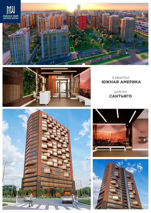 «Сантьяго» - это 21 этажный дом с красивым видом из окна,свободными планировками, которые легко подстроить под себя!Три лифта, один из которых - панорамный, скрасят вашу поездку, а на первом этаже вас встретит просторное лобби в стиле Сантьяго, уборная с пеленальным столиком, место для отдыха с удобными креслами!В квартале «Южная Америка» будет находится зеленая зона, в которой после рабочего дня можно будет отдохнуть с семьей.В шаговой доступности от квартала находится школа, детский садик, строящийся крупнейший в Беларуси ТОЦ “Avia Mall”, ст. метро «Аэродромная», которая уже запущена!Жизнь в районе «Минск-Мир» интересная, красочная и очень удобная, ведь все необходимое находится в шаговой доступности от дома! Приятные цвета, интересные дома, много новшеств для Белорусского рынка недвижимости - это лишь малая часть, за что выбирают Минск Мир!Не упустите шанс стать частью этого уникального сообщества! Запишитесь на осмотр квартиры уже сегодня и найдите свой идеальный дом!