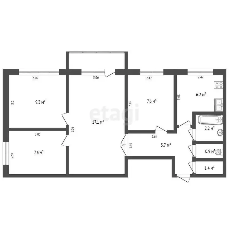 Квартира в панельном доме 1968 г. постройки. На 3 этаже угловая. по СНБ 58.6 кв.м2 Общая 57.8 кв.м2 4 комнаты 3 изолированные одна проходная. 7.6/7.6/9.3/17.1 кв.м2 кухня 6.2 есть кладовая комната. Туалет ванная раздельная. Балкон.