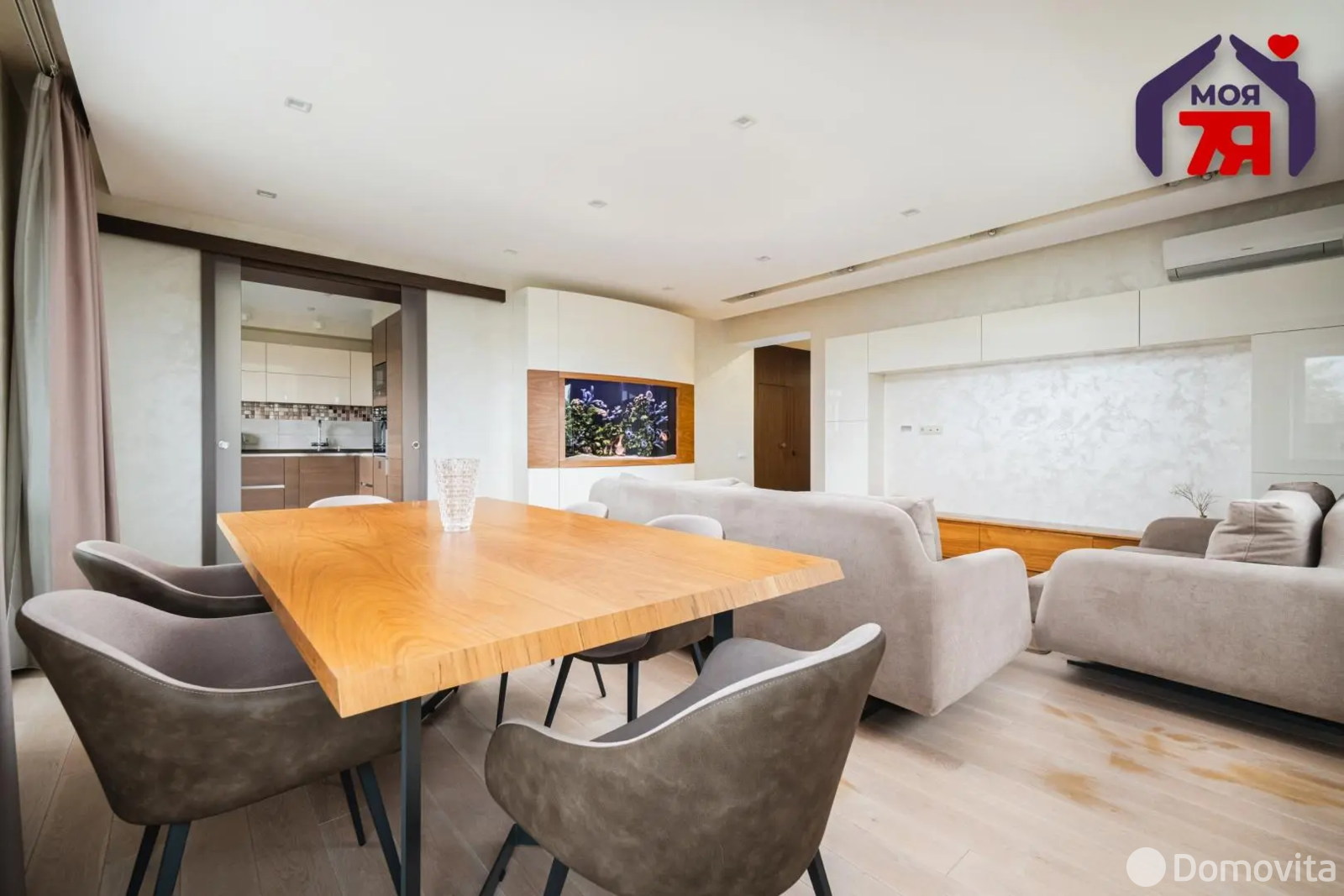 -Кухонная зона отделена раздвижной системой, что позволяет зонировать пространство по вашему сценарию - удобно для семейных ужинов или уединённого кофе по утрам. На кухне установлен итальянский гарнитур с каменной столешницей и встроенной техникой Bosch: плита, духовой шкаф, микроволновка, холодильник, морозильник и даже дополнительный морозильник.