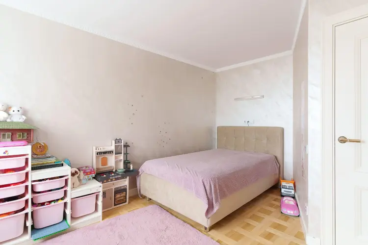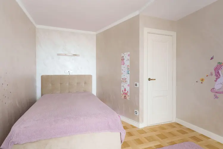 Большая спальня 18.5 м2. Детская 13.3 м2 и гостевая комната(кабинет) 13.4 м2. Большая кухня 13.9 м2, встроенный кухня со всей необходимой техникой «BOSСH». Два санузла. Санузлы облицованы плиткой, установлена испанская сантехника Roca, бойлер.