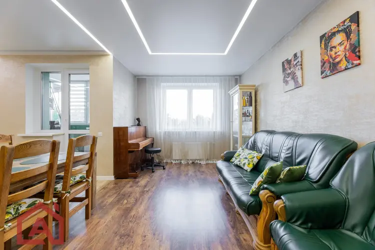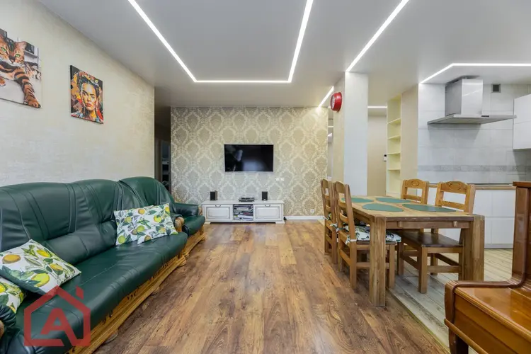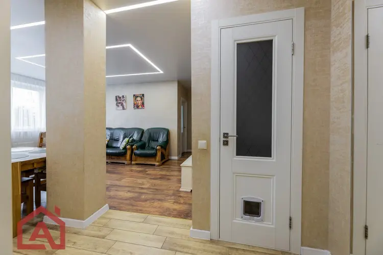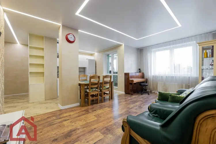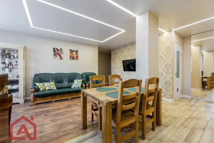 - Современный ремонт: просторная квартира с дизайнерским ремонтом. Окна ПВХ. Стены выровнены и оклеены качественными обоями, в интерьере использованы приятные оттенки. На полу -ламинат. Продумано несколько сценариев освещения. Все это создает приятную и уютную атмосферу.