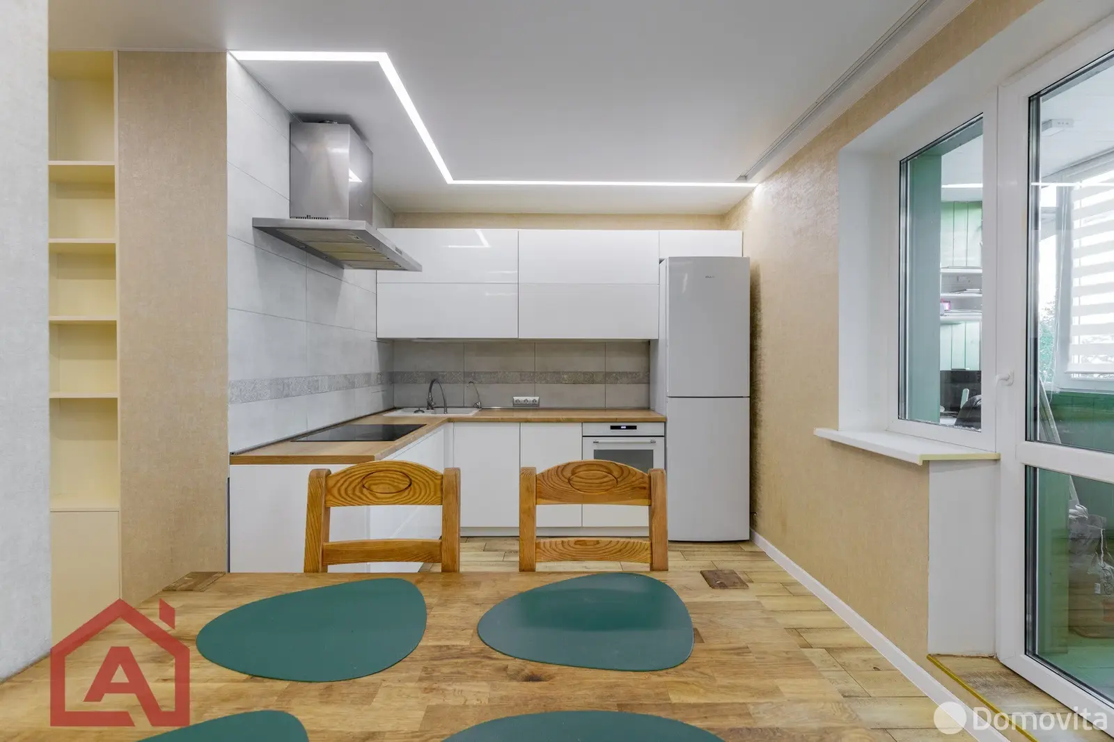 -В просторной гостиной (жилая с кухонным оборудованием) площадью 39,4м2: имеется мягкая мебель, телевизор, консоль под телевизор. Кухонная мебель, встроенная кухонная техника и качественная мебель. Из кухни обустроен выход на застекленную лоджию. Организована зона для приема пищи: обеденный стол и стулья.