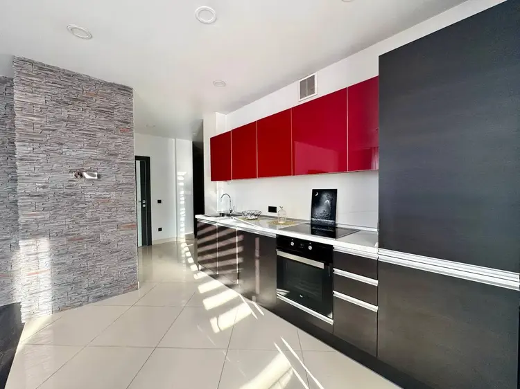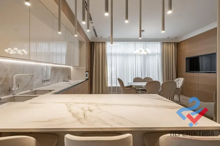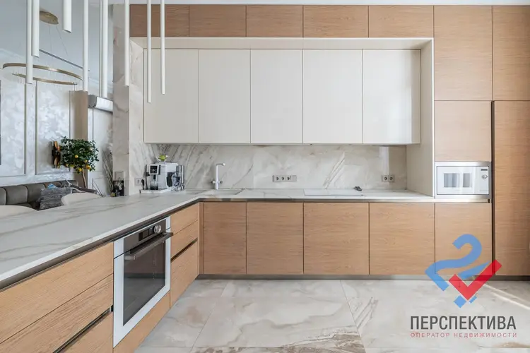 Встроенная кухня отличается большой рабочей поверхностью и фурнитурой на доводчиках. Она оснащена всей необходимой техникой: