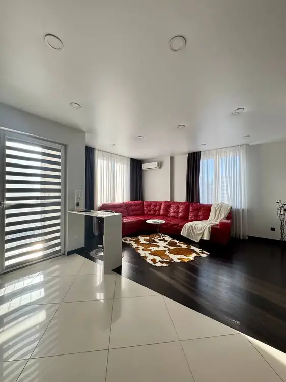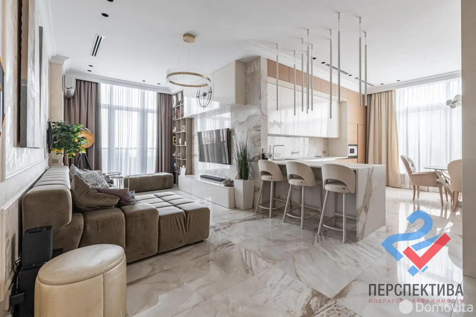 Пентхаус включает в себя: кухню-столовую, гостиную, две детские комнаты, главную спальню с собственным санузлом и постирочной, кладовку, террасу и совмещенный санузел. Высота потолков составляет 3.33 метра, что создает ощущение комфорта и свободы. Выполнен дизайнерский ремонт с использованием высококачественных и экологичных материалов. В жилых комнатах на полу уложена инженерная доска, в прихожей, гостиной и кухне — керамогранит.