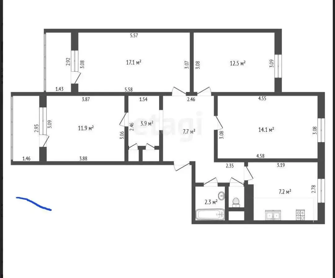 Четыре жилые комнаты 17,1м2, 14,1м2, 12.5 м2, 11,9 м2