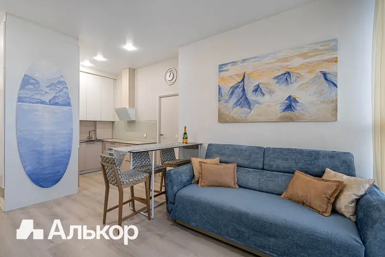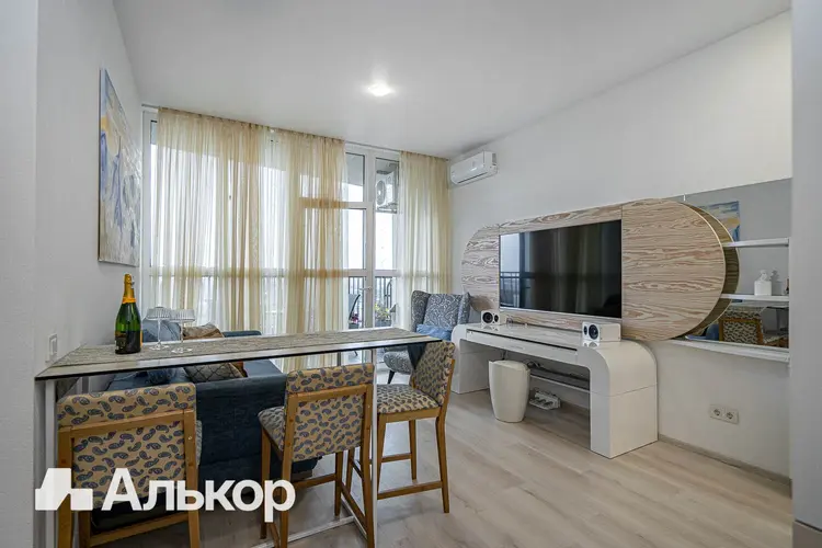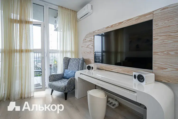 Современный интерьер в стиле «минимализм»: цветовая палитра светлая; грамотно и функционально спланированное пространство; большие окна соединяют квартиру с окружающим миром, делая его частью интерьера. Полностью укомплектована мебелью и новой техникой: электрическая варочная панель, духовой шкаф, встроенные холодильник и посудомоечная машина, вытяжка, кондиционер, стиральная машина, телевизор. Много мест для хранения: большой встроенный шкаф во входной зоне, встроенные шкафы в двух комнатах.