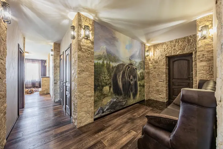 • Второй этаж оформлен в стиле лофт. Стены выложены натуральным красным кирпичом.