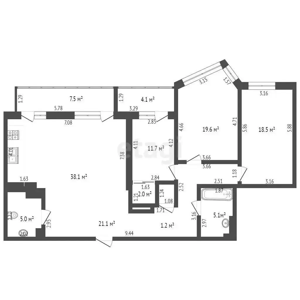 - Четыре полноценные комнаты: 18,5 м2, 19,6 м2, 11,7 м2, а также просторная кухня-гостиная 38,1 м2 — оптимальное решение для организации личного пространства каждого члена семьи