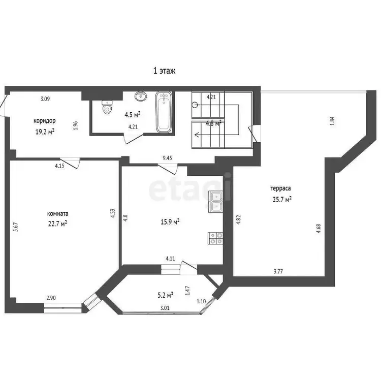 Просторный хол 18.8м.кв, светлая гостиная с камином 28.2 м.кв, кухня 13.7 м.кв, две спальни 16 и 18 м.кв, кабинет 11м.кв, большой санузел 10м.кв.