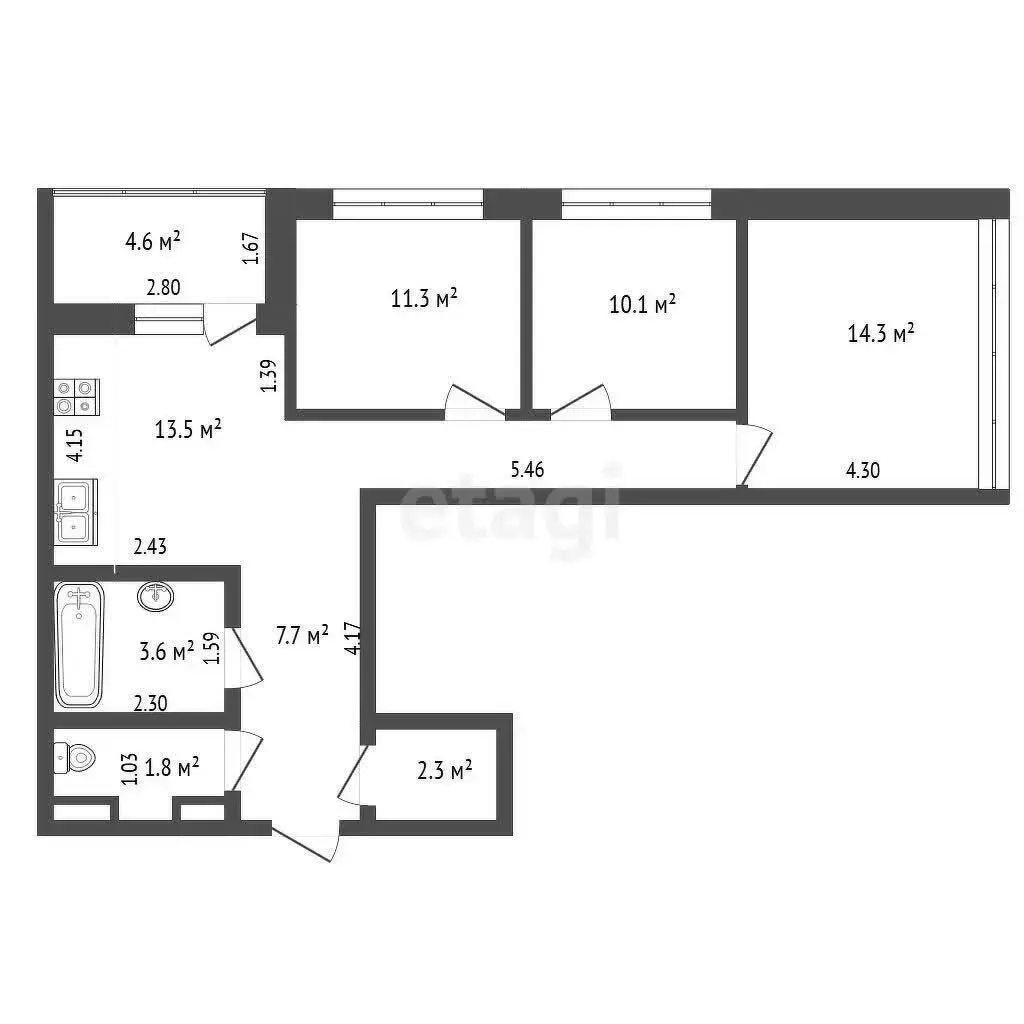 • 3 отдельные спальни (14,3; 10,1 и 11,3 м2)