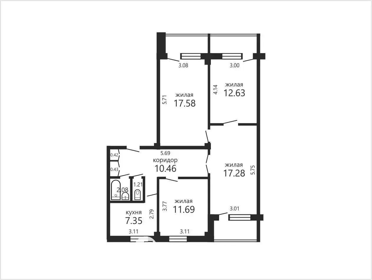 Смежные комнаты - 12,63м.кв. и 17,28м.кв. в хорошем состоянии, есть возможность разделить. Пол- линолеум, потолки окрашены, стены оклеены обоями, окна – деревянные. Лоджии застеклены, рамы деревянные.
