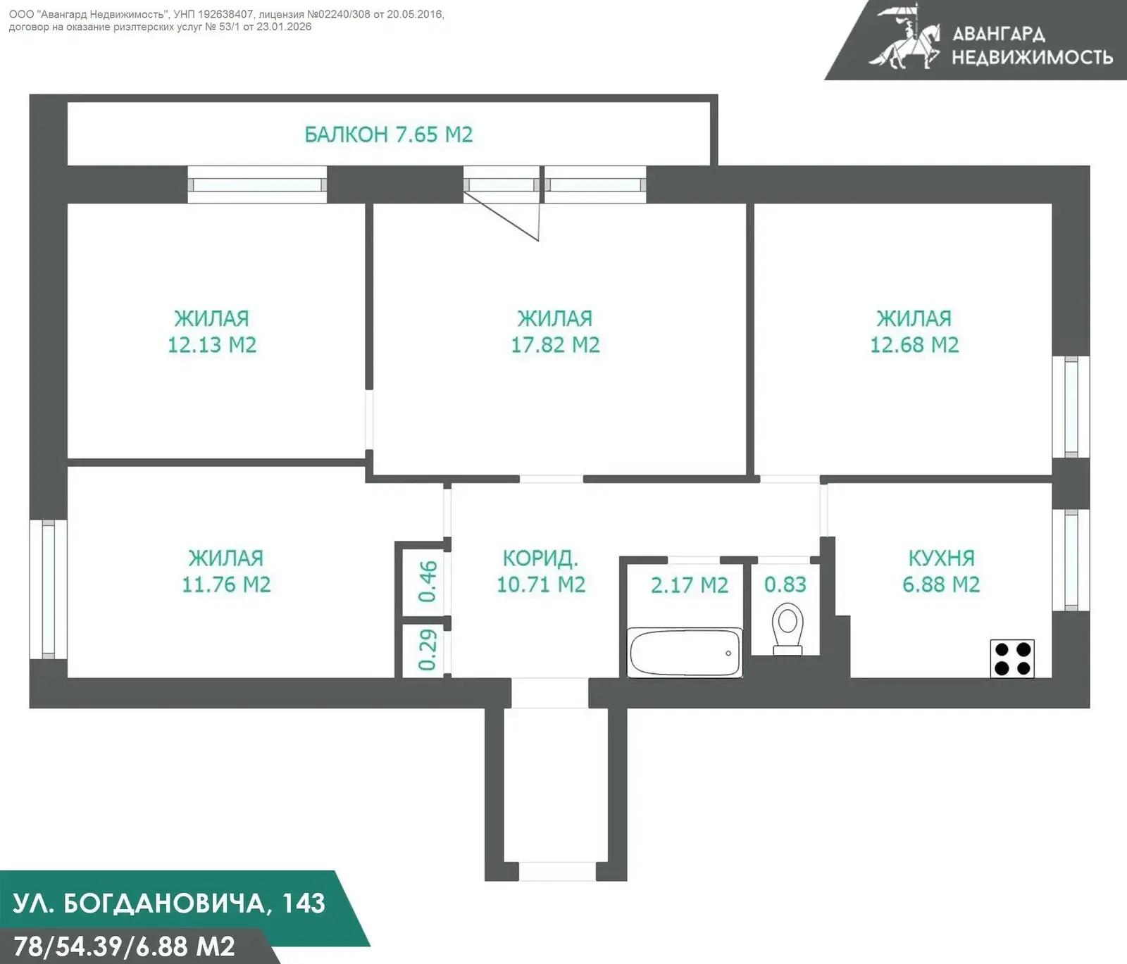 Квартира общей площадью 78 м2 по СНБ. расположена на 7 из 9 этаже.