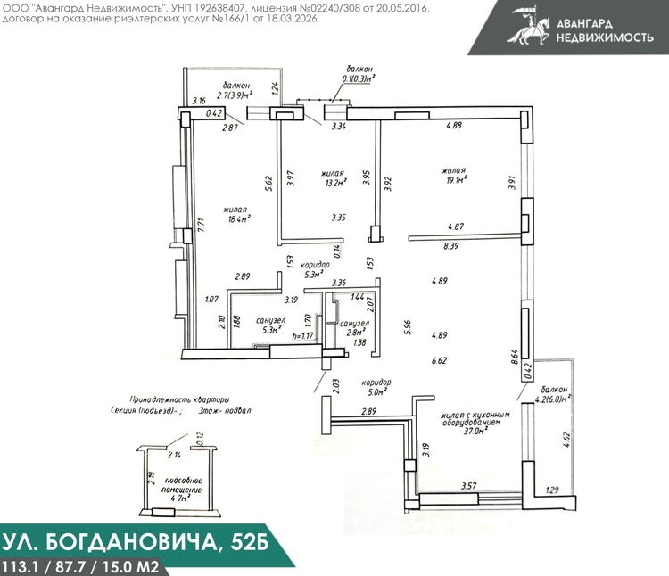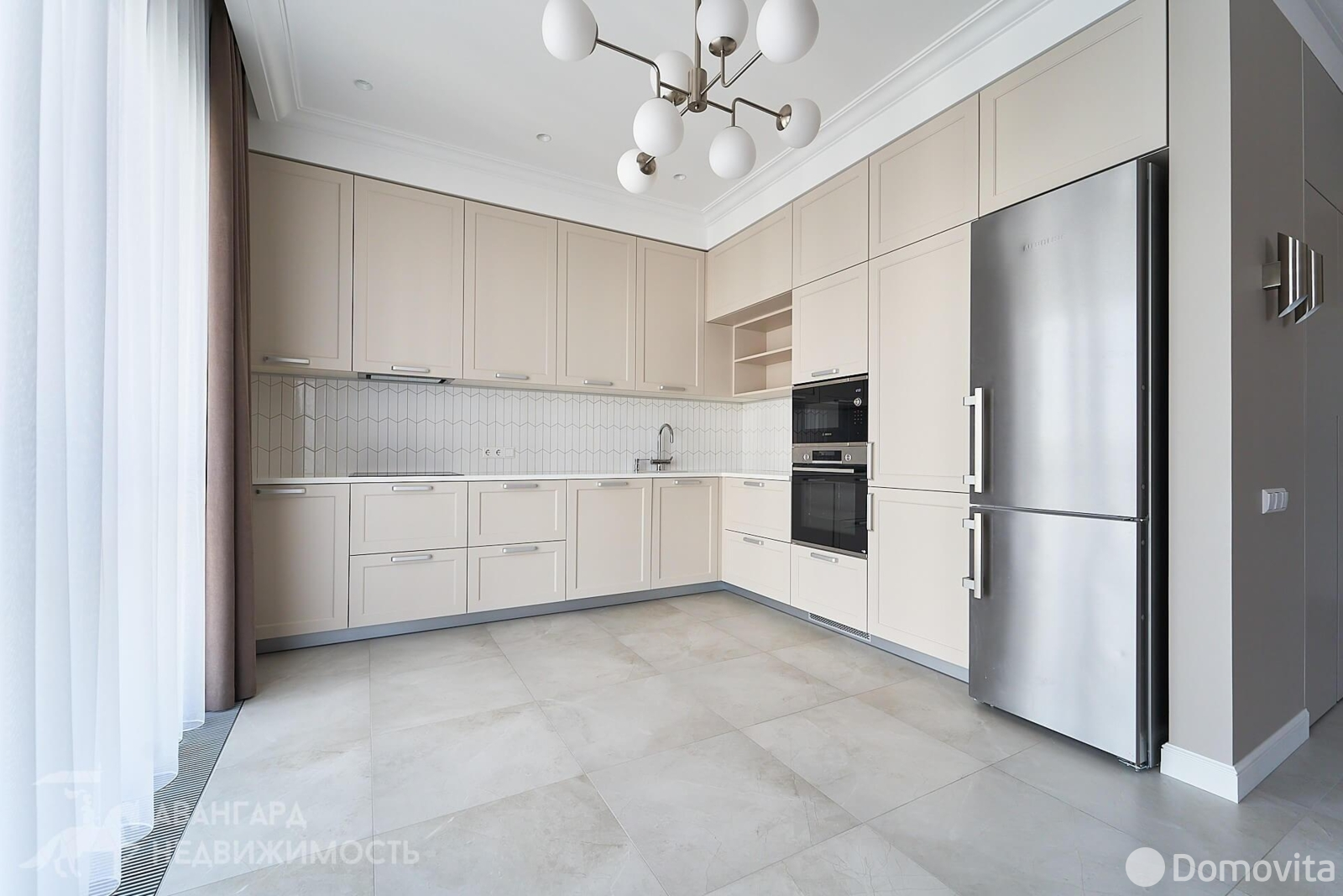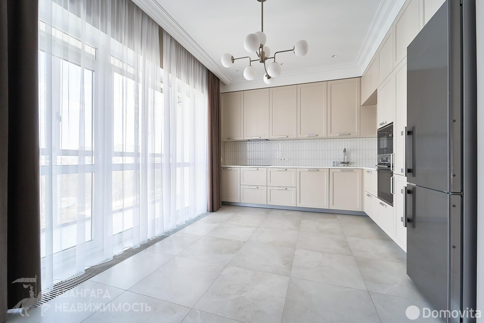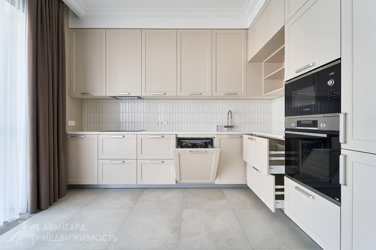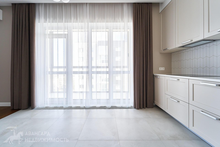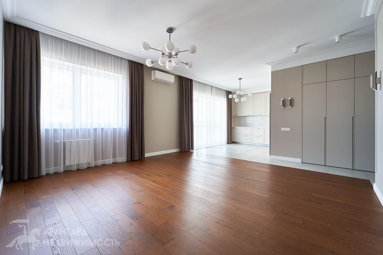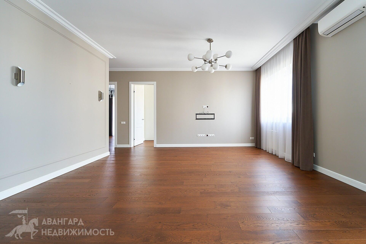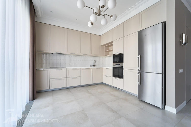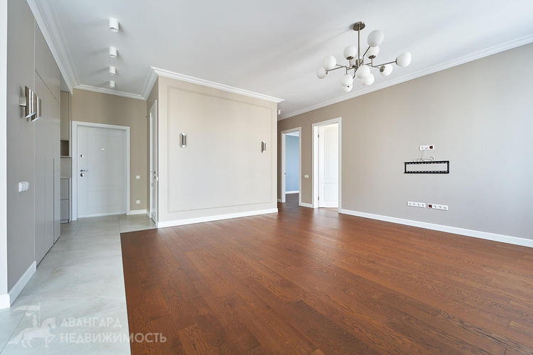 Площадь квартиры по СБН: 113.1 м2. В квартире продуманная планировка: очень просторная кухня-гостиная, три спальни, два санузла, гардеробная комната. Высота потолков 3 метра.