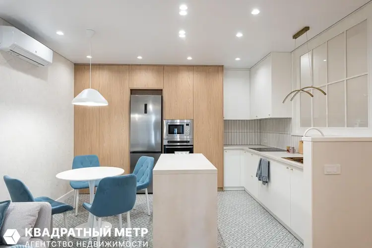 Кухня-гостиная с островной планировкой, оснащена полным комплектом техники Maunfeld: посудомоечной машиной, индукционной плитой, духовым шкафом, и отдельно стоящим большим холодильником. В вашем распоряжении огромное количество мест хранения. Предусмотрена сдвижная перегородка для усиления зонирования и приватности. Керамогранит, уложенный в этой зоне добавляет практичности, а удобный диван перед ТВ-зоной, и разные сценарии освещения выгодно подчеркивают детали интерьера.