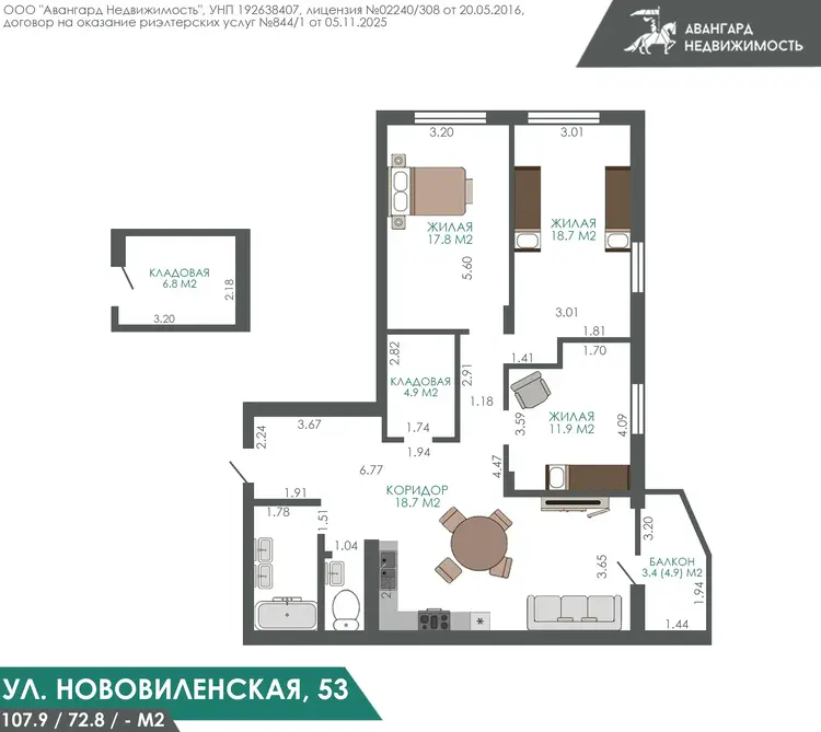 - Квартира расположена на высоком 8м этаже из 9ти. Общая площадь 107.9м2. Современная удобная планировка: 3 изолированные комнаты, большая гостиная с кухонным оборудованием и отдельная гардеробная. Высота потолком 2.74м.
