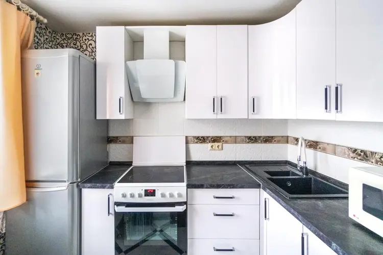 - Кухня облицована плиткой, встроенный кухонный гарнитур, встроенная техника.