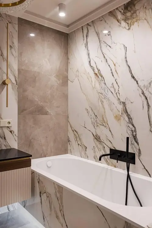 Кухня оснащена современной техникой от ведущих производителей: духовой шкаф, варочная панель и микроволновая печь Siemens, посудомоечная машина Bosch, холодильник и морозильная камера Liebherr. В ванных комнатах установлена сантехника Hansgrohe и Villeroy & Boch, а также керамогранит премиум-класса.