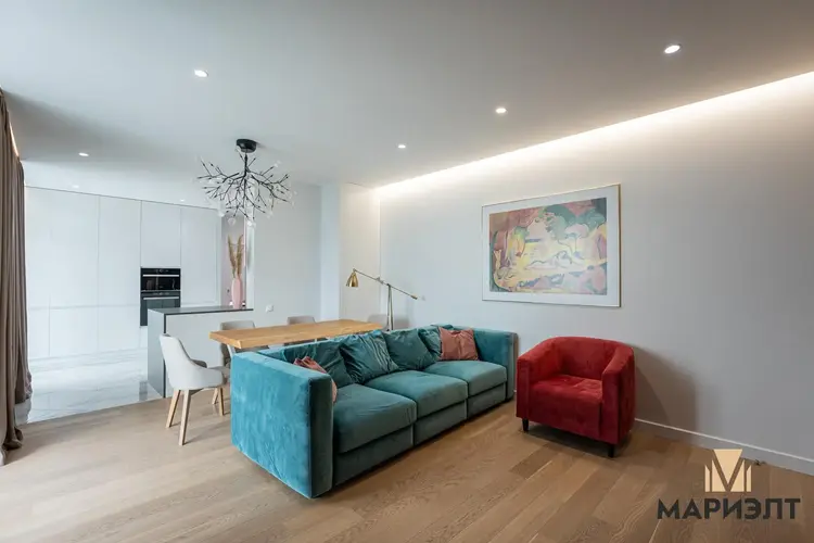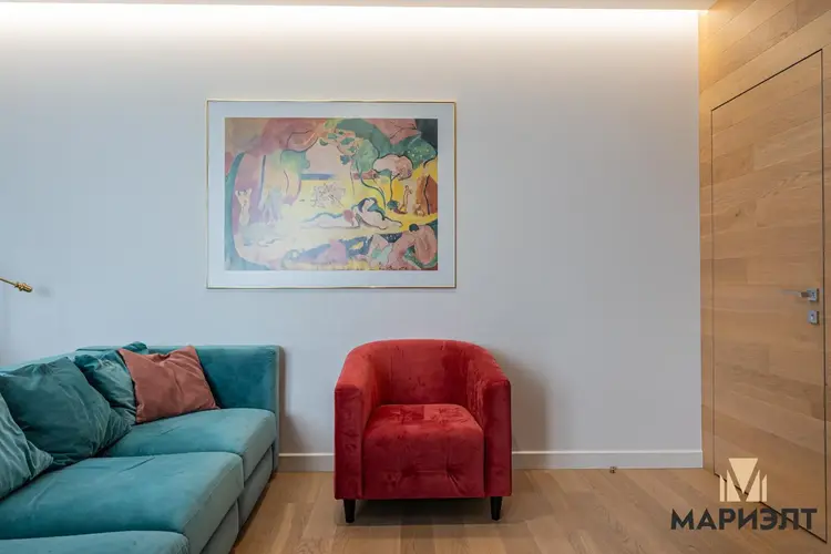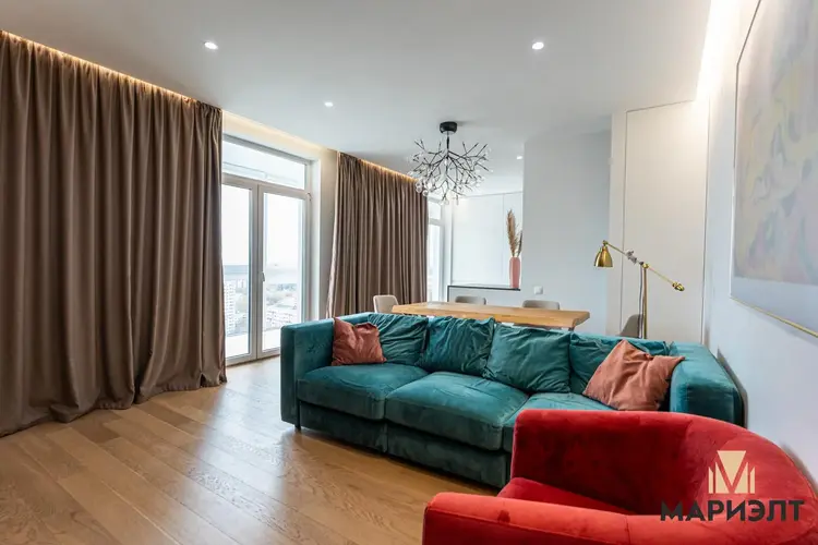 В гостиной расположены: диван, кресло, обеденный стол из массива дуба и стулья. Интерьер украшают репродукция Анри Матисса "Радость жизни", стильные светильники и телевизор на стене. Из гостиной с французскими окнами в пол открывается прекрасный вид на Минск.