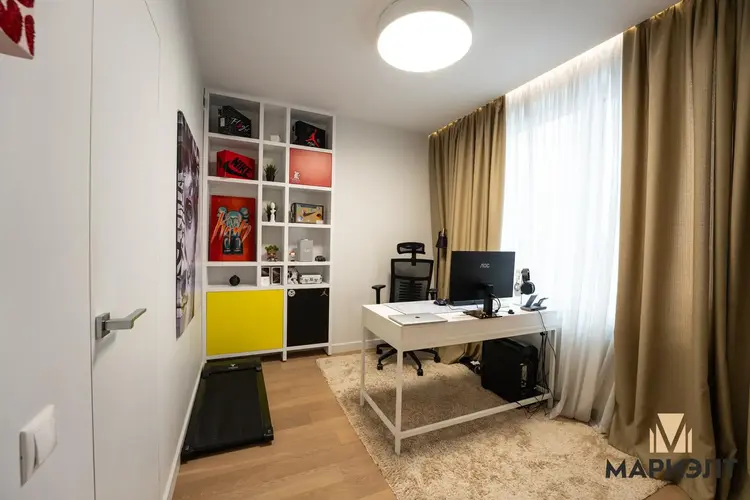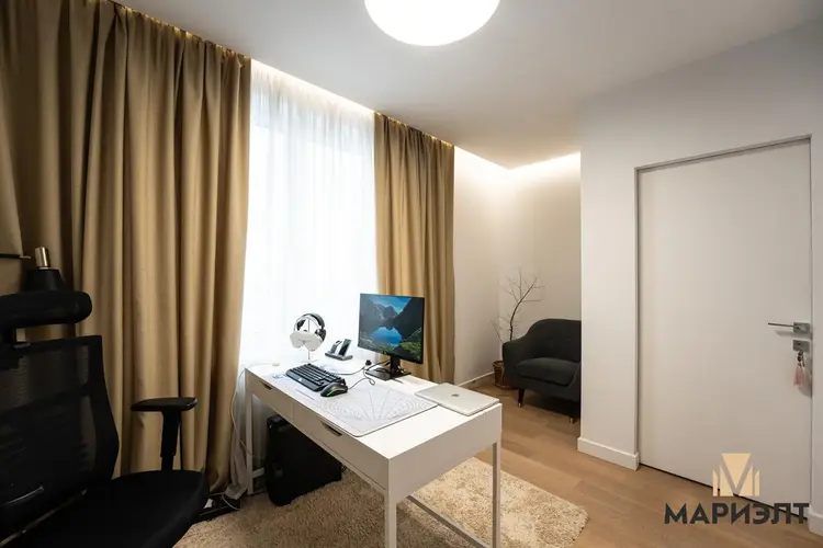 Детская комната полностью оборудована: шведская стенка, тахта, вместительный шкаф. В кабинете размещён стеллаж по мотивам произведений Пита Мондриана. В спальне изголовье кровати обтянуто декоративной мебельной тканью, установлены европейские светильники. В гостиной — люстра от известного производителя.