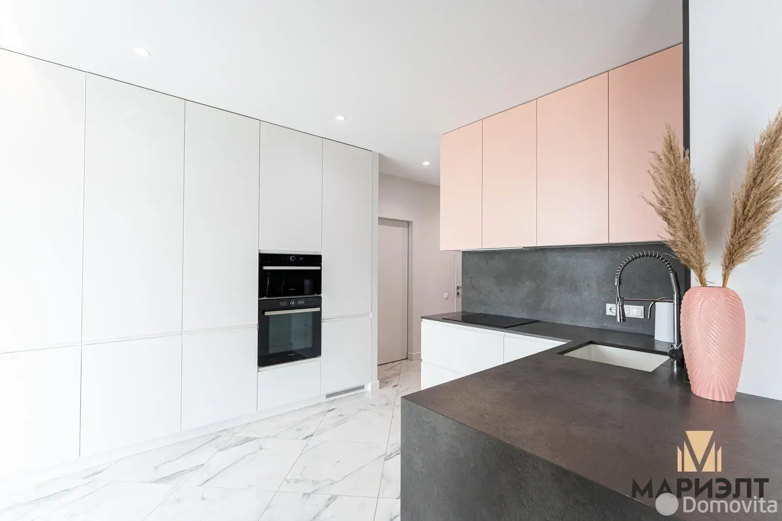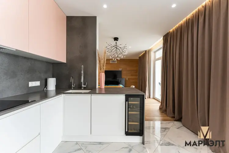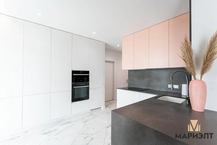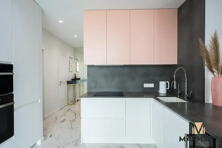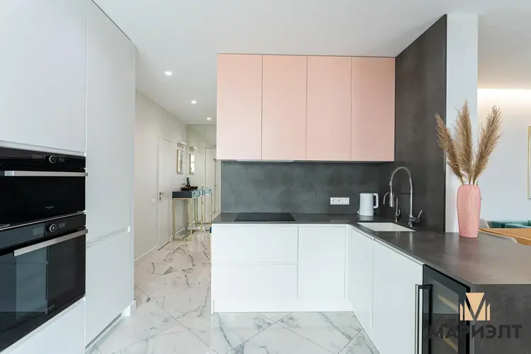 Кухня оснащена встроенной бытовой техникой: варочная поверхность, духовой шкаф, вытяжка, холодильник, микроволновая печь, винный шкаф и посудомоечная машина от известных брендов. Продуманная планировка позволяет готовить и одновременно быть в общей зоне гостиной, а места для хранения – более, чем достаточно.
