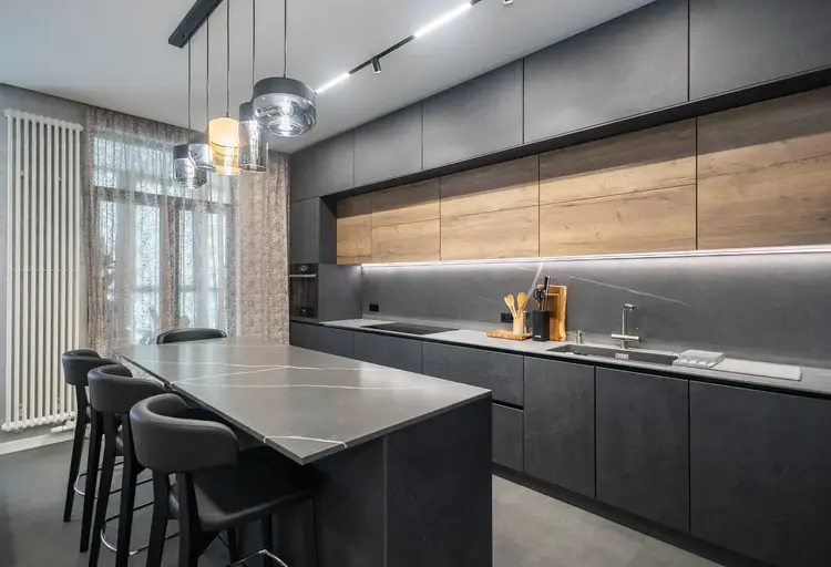 Кухонный гарнитур на заказ немецкого производства с интегрированной бытовой техникой, двумя встроенными холодильниками, измельчителем и островом из натурального камня