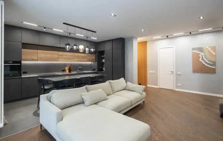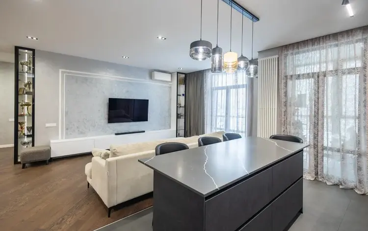 Просторная гостиная, совмещенная с зоной столовой и кухней