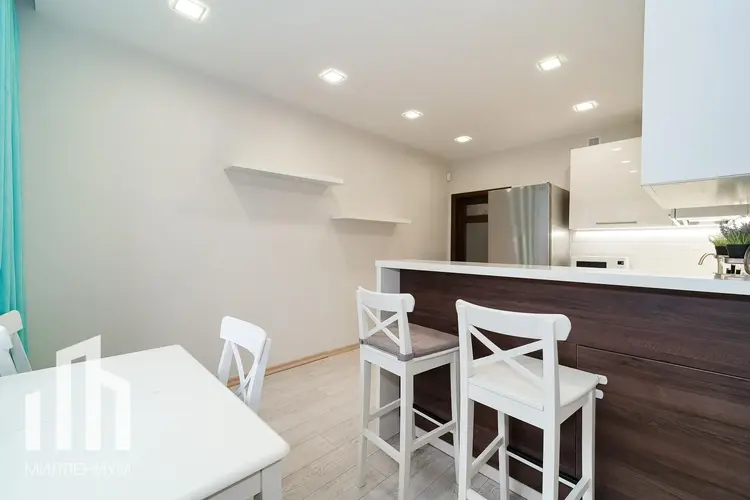 Просторная гостиная с кухней имеет панорамные 7-ми метровые окна в ширину выходящие на юго – восток и наполняют комнату дневным светом, делают ее визуально еще более просторной. Встраиваемая элитная кухня Lange фабричного производства. Оснащена всем необходимым. Любая хозяйка будет довольна местами для хранения, техническим оснащением, пространством кухни. За тепло и комфортный микроклимат отвечают стальные трубчатые радиаторы Arbonia, окна Rehau трехкамерные со светоотражением и мощный кондиционер. Из этого пространства можно попасть в кабинет, который с легкостью превращается в дополнительную комнату отдыха.