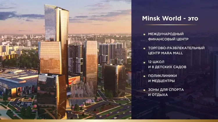 В Minsk World возводится Международный финансовый центр, символ деловой энергии современной Беларуси, а также крупнейший в стране торгово-развлекательный комплекс «Avia Mall».