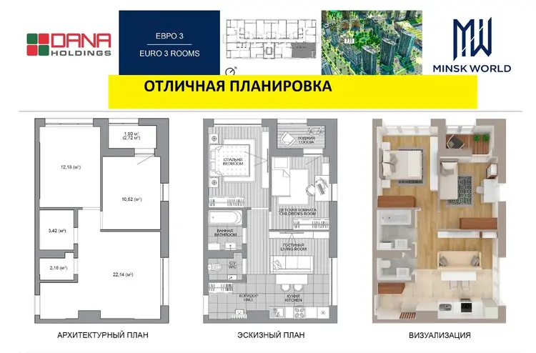 · внутри квартала - детские площадки для разных возрастов детей, в пешей доступности будет вся собственная инфраструктура Minsk World – взрослая и детская поликлиника, медицинский центр, кафе и магазины, парковки и заправки, спортивные залы и фитнес-центры