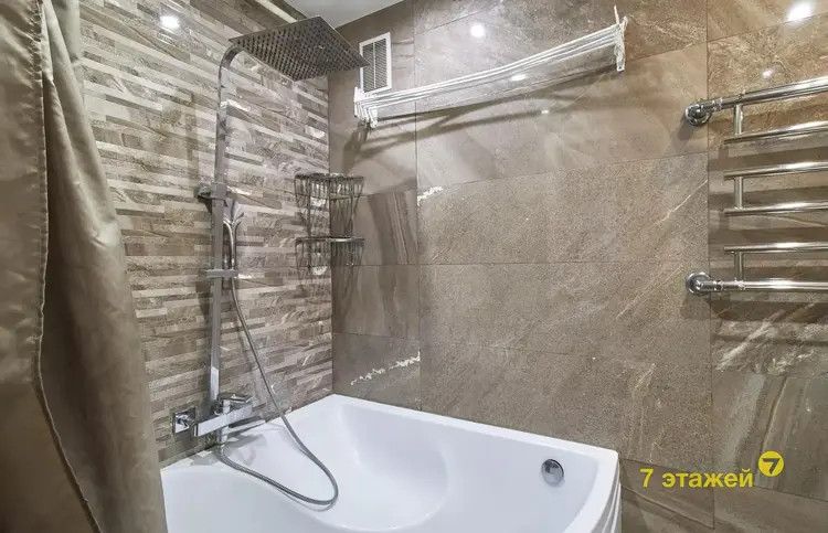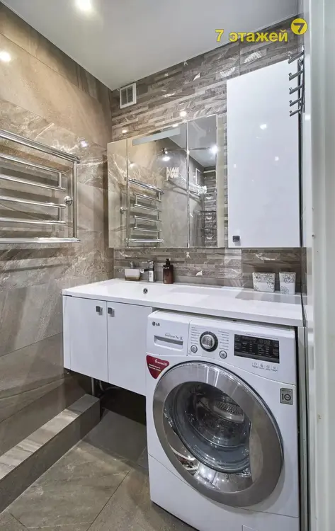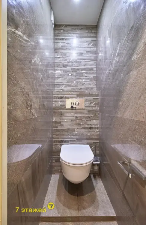 Ванная и санузел раздельные — облицованы плиткой с благородной текстурой камня. Ванная комната укомплектована ванной, хромированным полотенцесушителем, стиральной машиной и умывальником встроенным под длинную, удобную столешницу. Санузел с инсталляцией и современным подвесным унитазом.