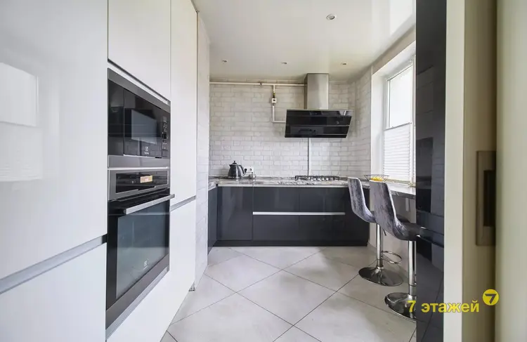 На кухне есть встроенная микроволновая печь и духовой шкаф, электрическая варочная поверхность, вытяжка и вместительный отдельностоящий холодильник. Большая площадь кухонной столешницы переходящей в барную зону у окна позволит готовить на этой кухне любые кулинарные шедевры! А раздвижная дверь позволит при необходимости отделить гостиную во время готовки, обеспечивая тишину и комфорт в обеих зонах.