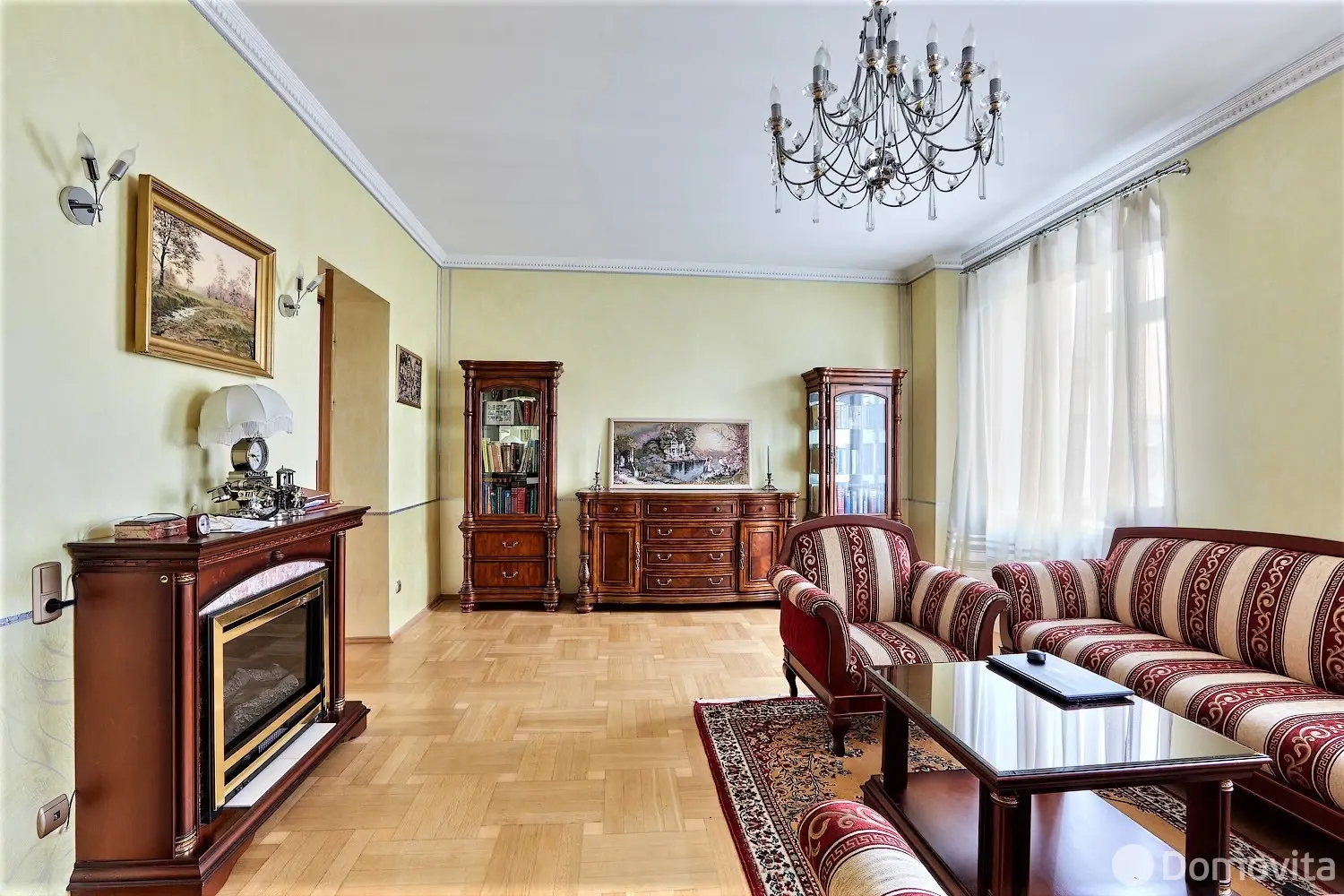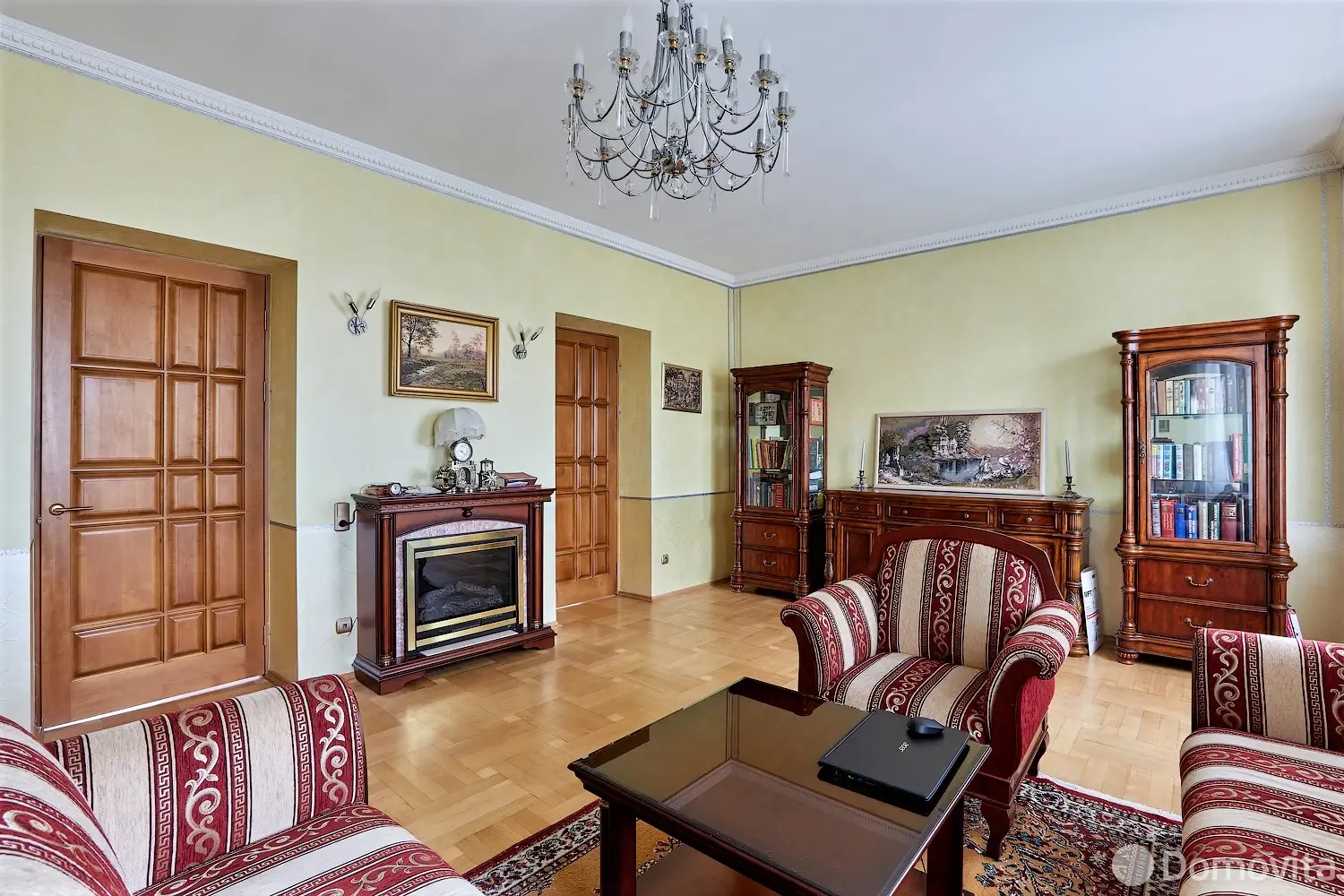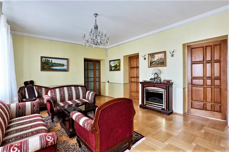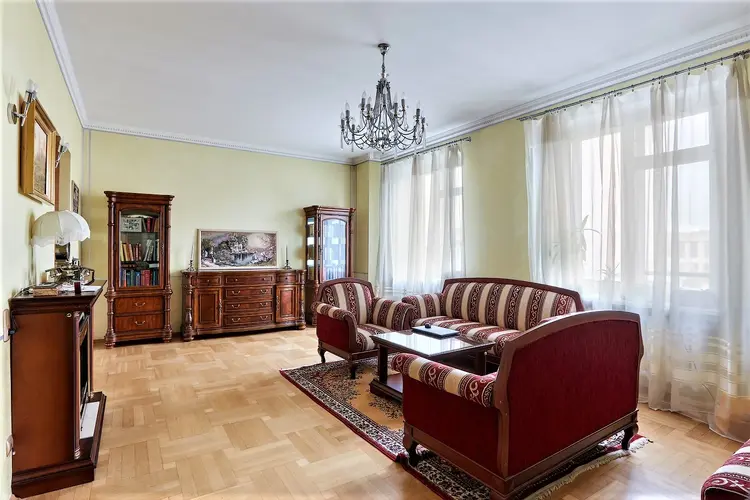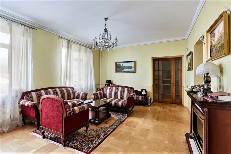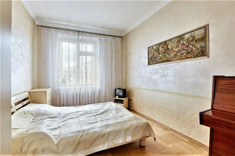 В доме железобетонные перекрытия. Заканчивается капремонт дома. В квартире специалистами был выполнен полный добротный ремонт с применением качественных импортных материалов. Просторные комнаты с шикарным видом из окон на главный проспект столицы. Площадь квартиры – 117,2 м2, жилая площадь – 79,3 м2 (в том числе гостиная - 28,7 м2), кухня – 15,2 м2. Высота помещений 3,03 м. МЕБЕЛЬ ЧАСТИЧНО Встроенная кухня с техникой и барной стойкой. Из кухни – кованый балкон с французскими окнами (вид во двор). В квартире два санузла: гостевой площадью 1,3 м2 и санузел площадью 7,0 м2 с ванной и душевой кабиной. Также в квартире на стенах декоративная штукатурка, пол - дубовый паркет, входная металлическая дверь, межкомнатные двери – массив ольхи, в прихожей - встроенный шкаф с огромными зеркалами. Окна квартиры выходят на север и на юг. Оптоволоконный кабель, сигнализация. Есть подвал.