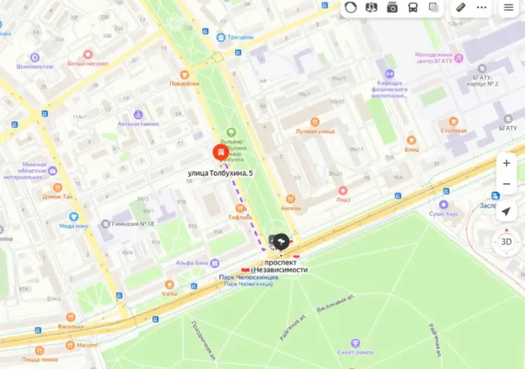 В доме расположены: парикмахерская, оптика, пиццерии «Терра Pizza» и «Сказочный замок» Смежное здание – Академия искусств, во дворе - Политехнический колледж БГУ. В шаговой доступности Ботанический сад и Парк Челюскинцев, а также Дворец водного спорта, магазины «Евроопт», «LiderExpress», «Соседи» и «1000 мелочей», кафе «Васильки», кинотеатр "Октябрь", Национальная академия наук Беларуси и БНТУ.