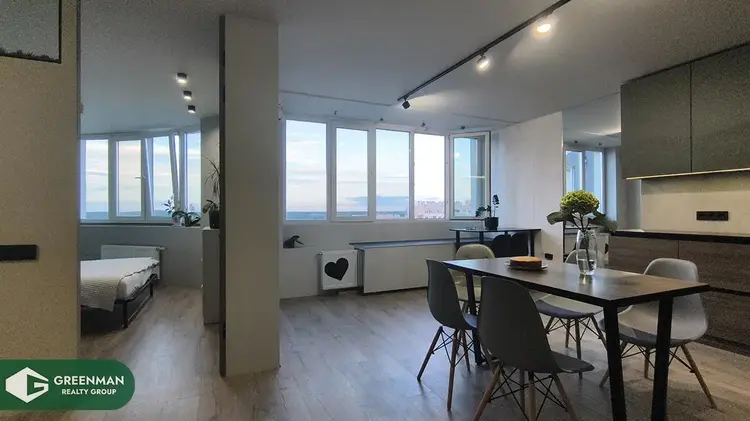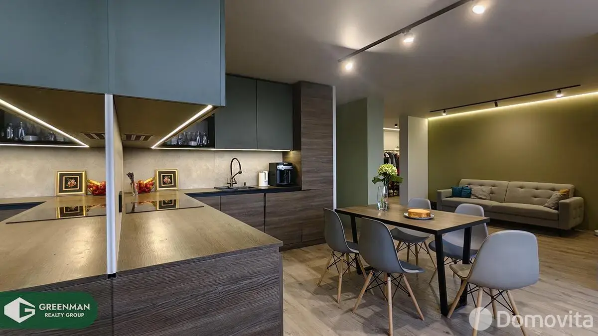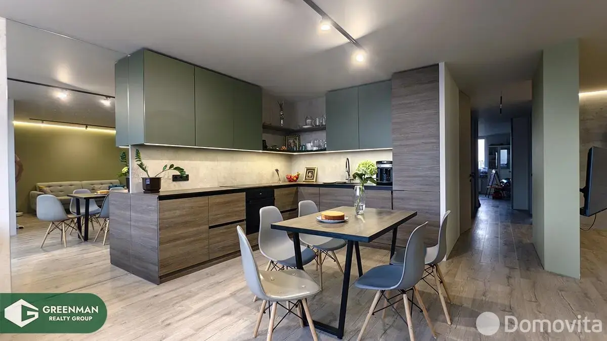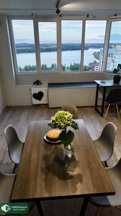 Продается видовая 5-ти комнатная дизайнерская квартира, общей площадью 126,9 м2. Расположенная по адресу, улица Ратомская 7, где закаты можно смотреть в онлайне, каждый день, находится на 15 этаже 15-ти. Гостиная - 44.32 м2 с видом на водохранилище Дрозды. выполнена совместно с кухней по индивидуальному проекту и оборудована всей необходимой техникой известных марок.